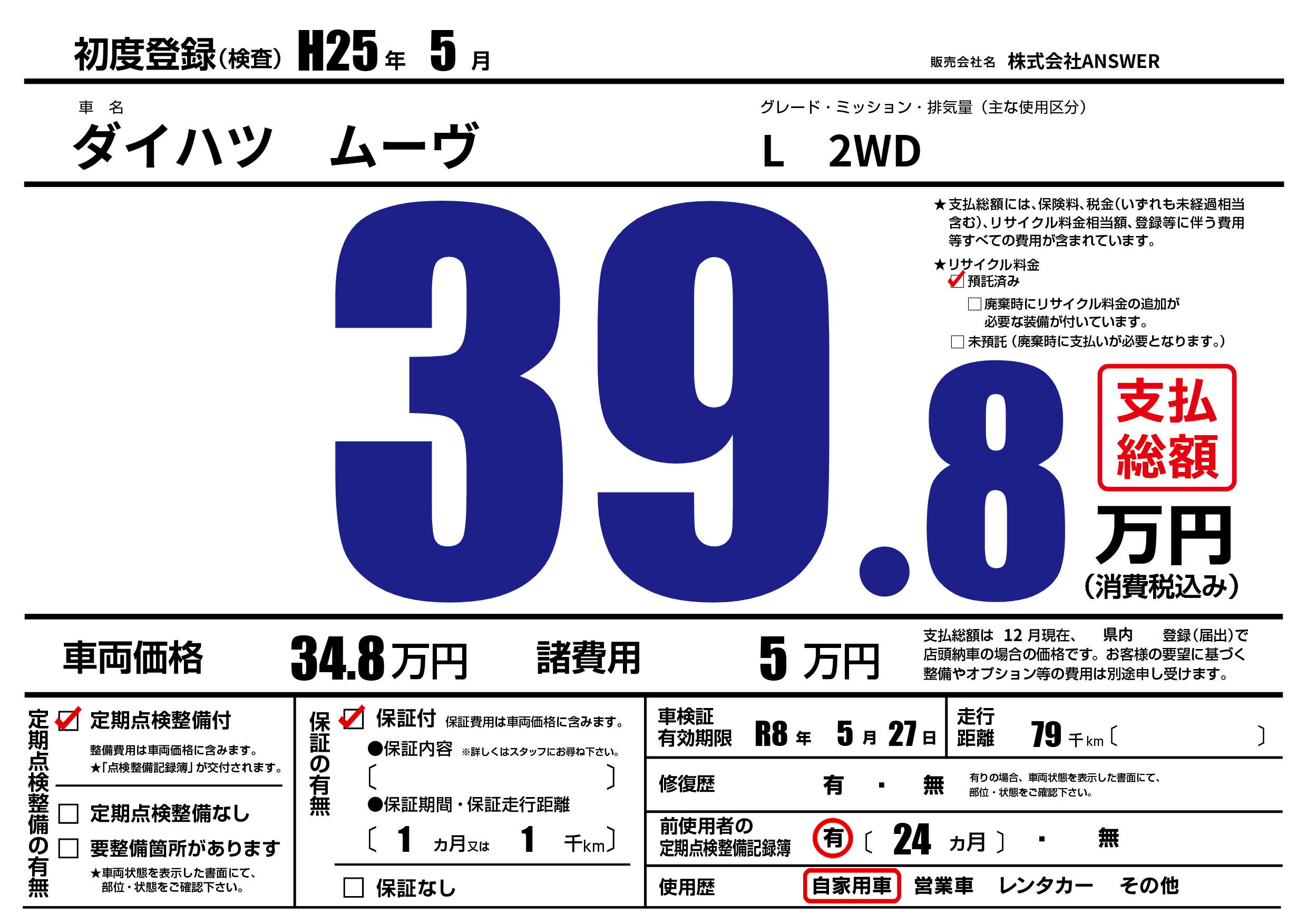 なし | 車検制限 | R8年5月27月 |