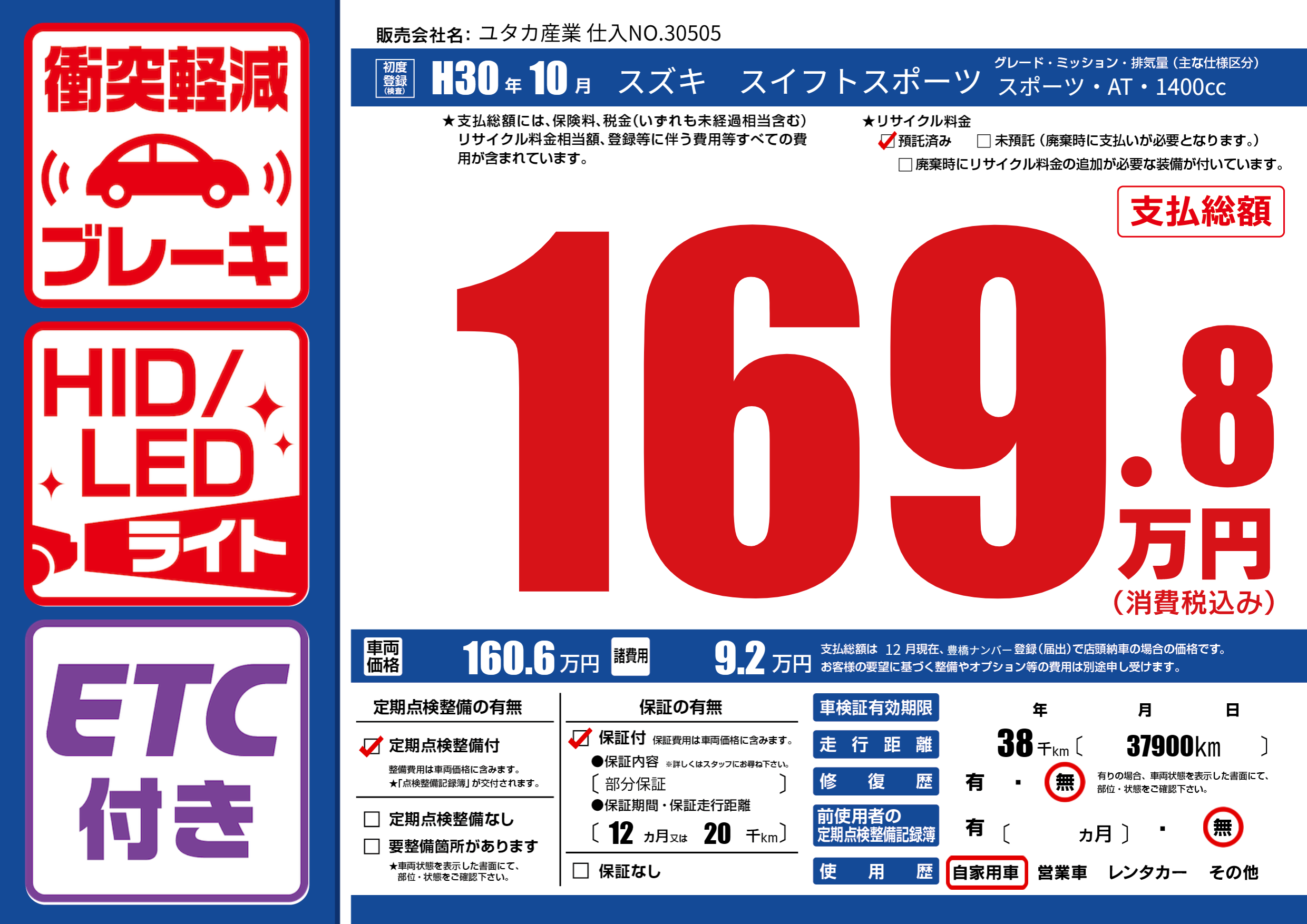 | 車名 | スズキ スイフトスポーツ | グレード ミッション 排気量 |