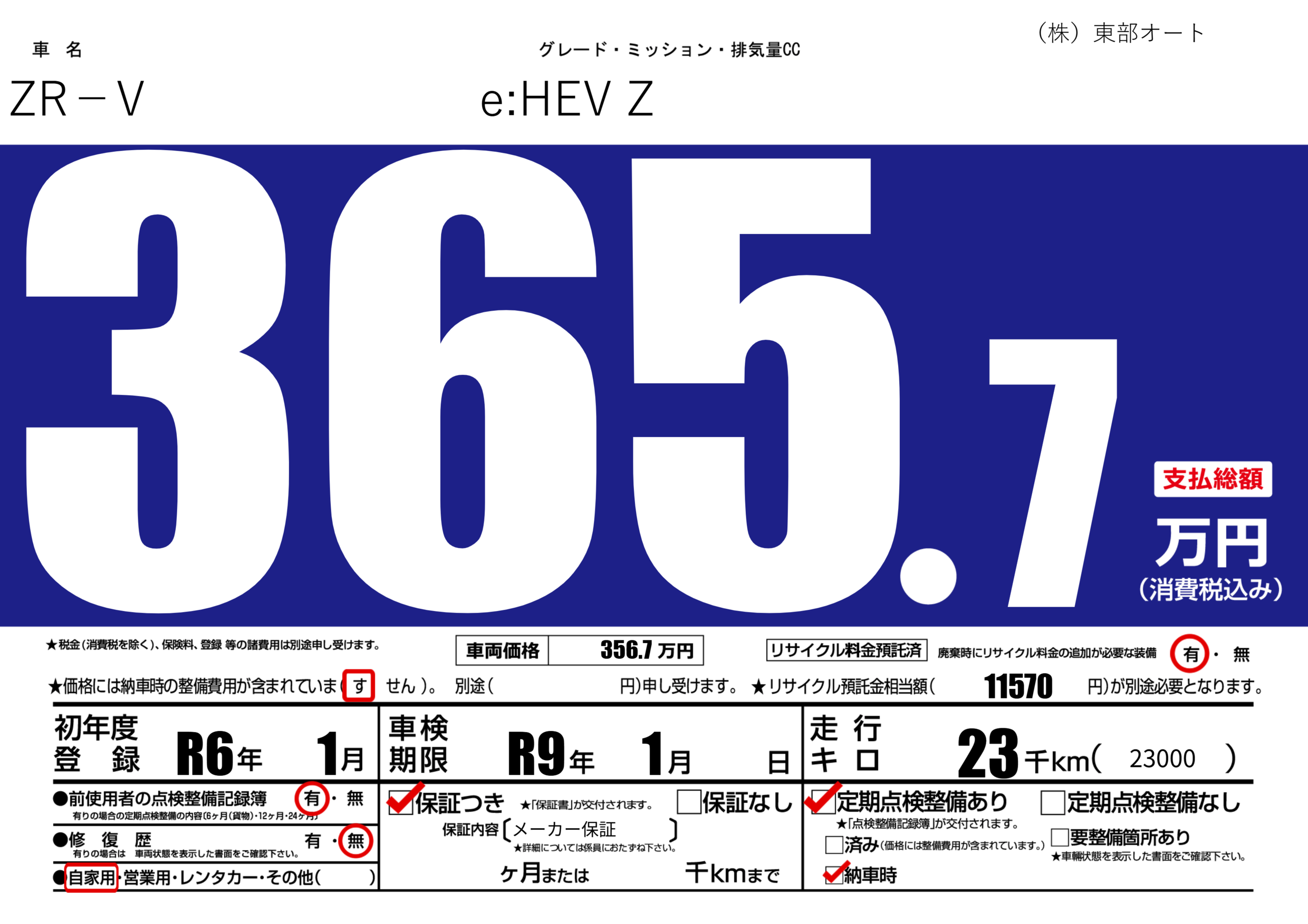 | 車名 | ZR-V | グレード ミッション 排気量 |