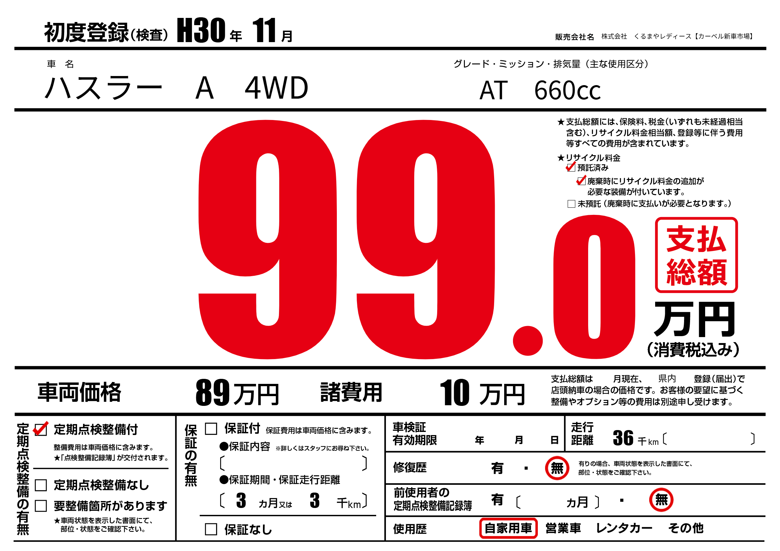 | 走行キロ | 3.6万km | 初年度登録 | H30年11月 |