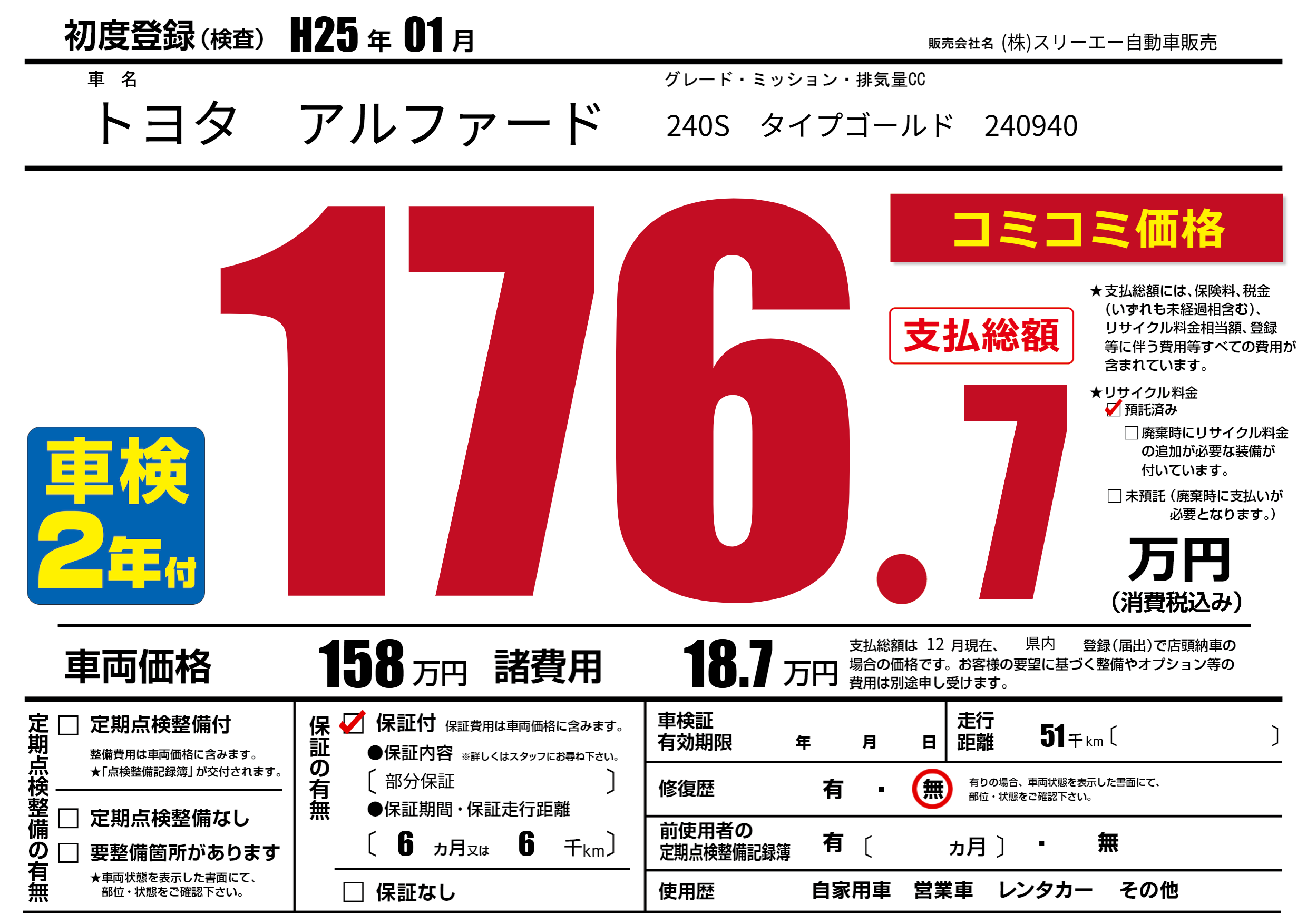 | 車名 | トヨタ アルファード | グレード ミッション 排気量 |