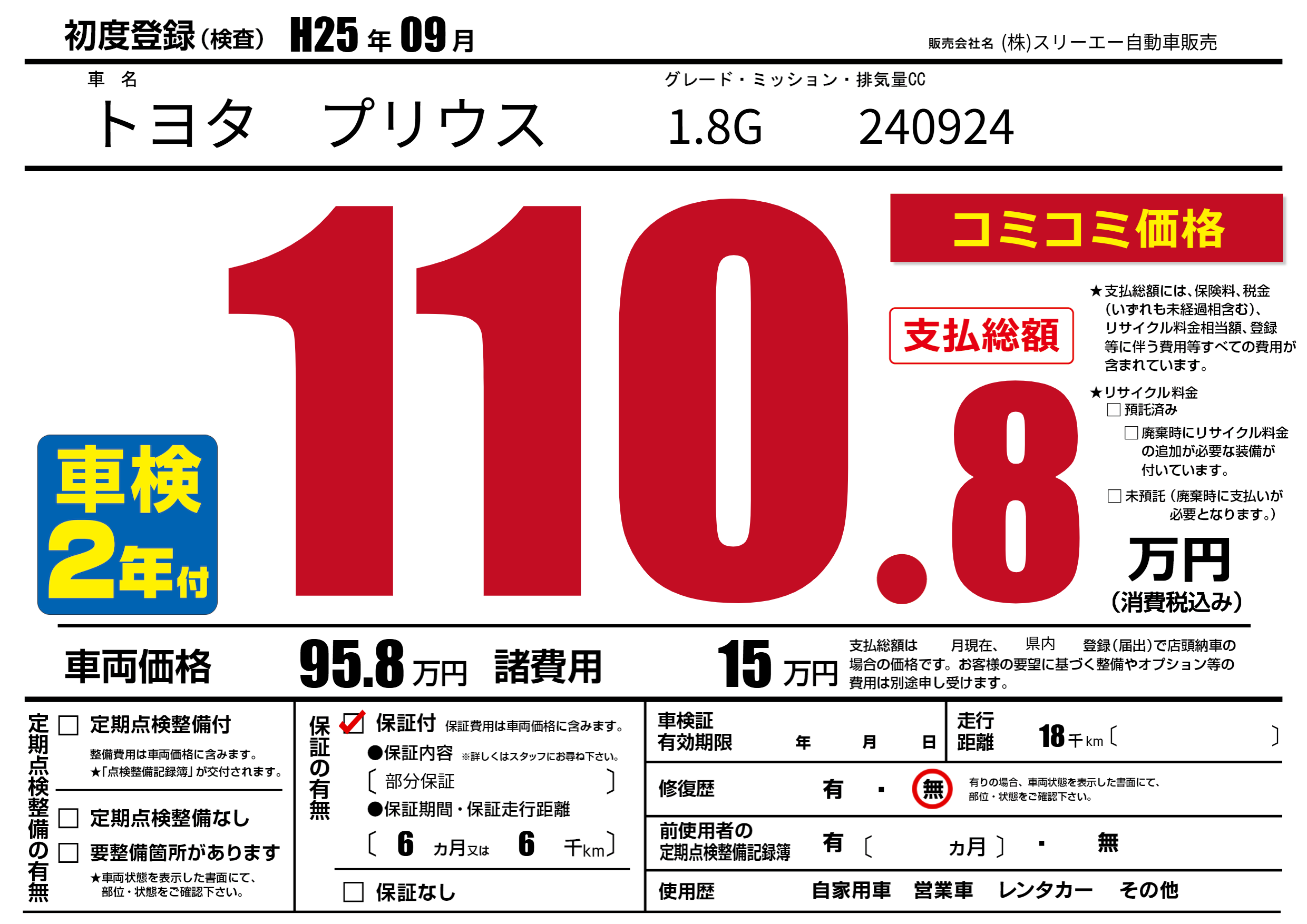| 車名 | トヨタ プリウス | グレード ミッション 排気量 |