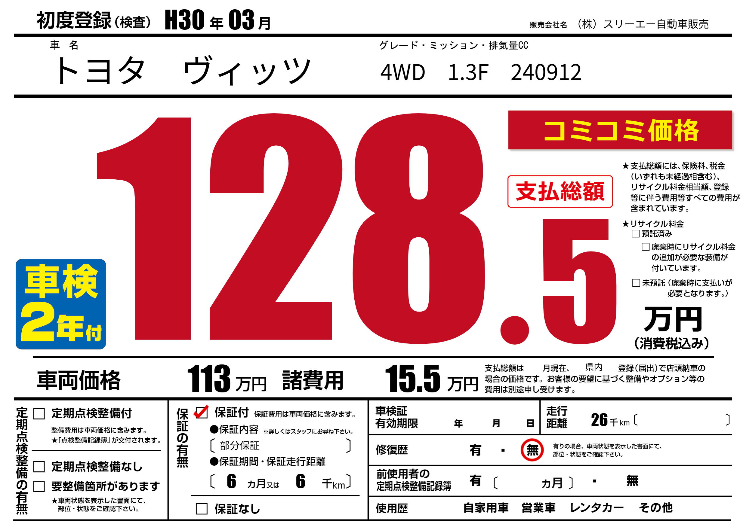 保証付き 保証内容(部分保証) 6ヶ月または(6)千kmまで |