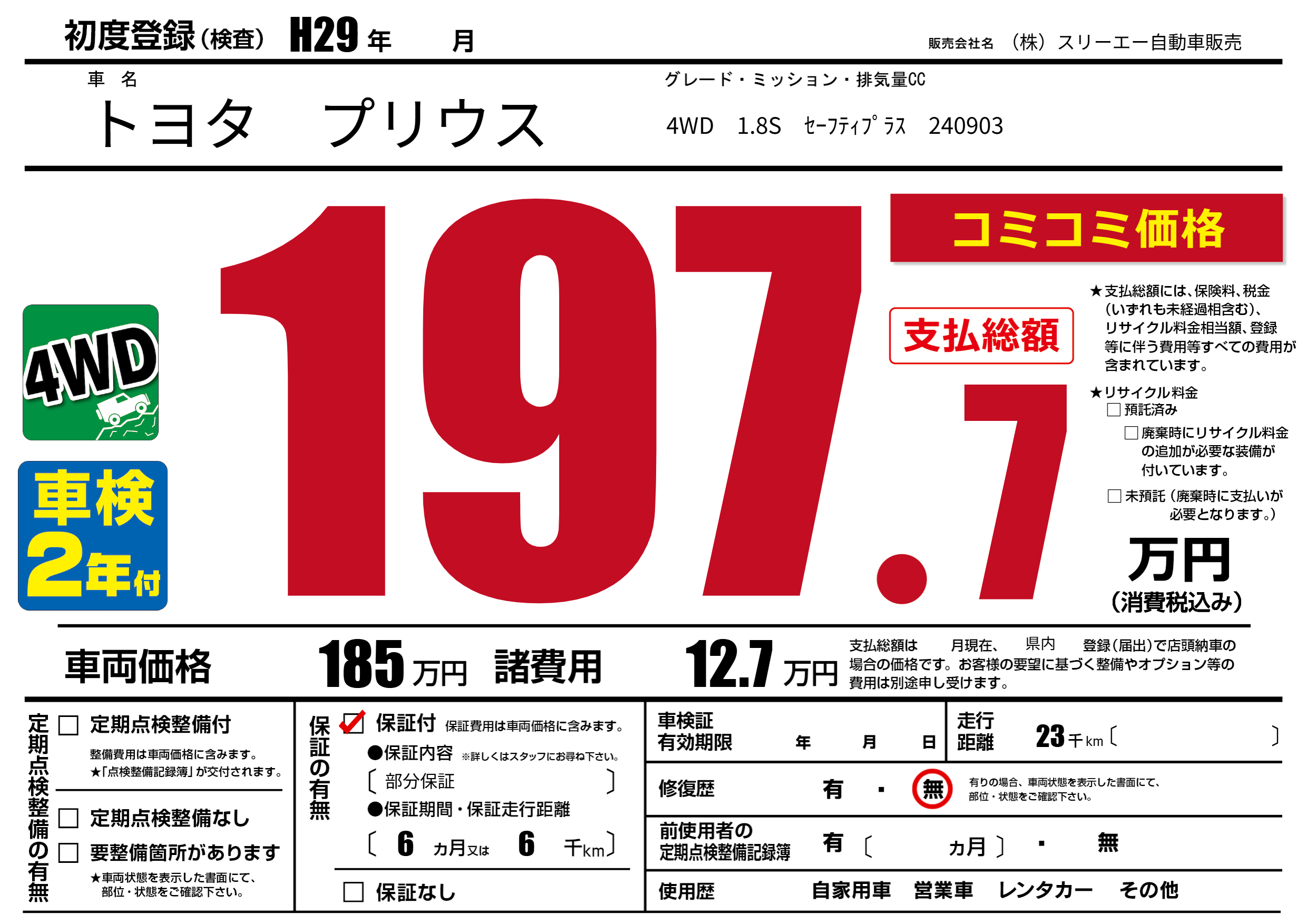 | 車名 | トヨタ プリウス | グレード ミッション 排気量 |