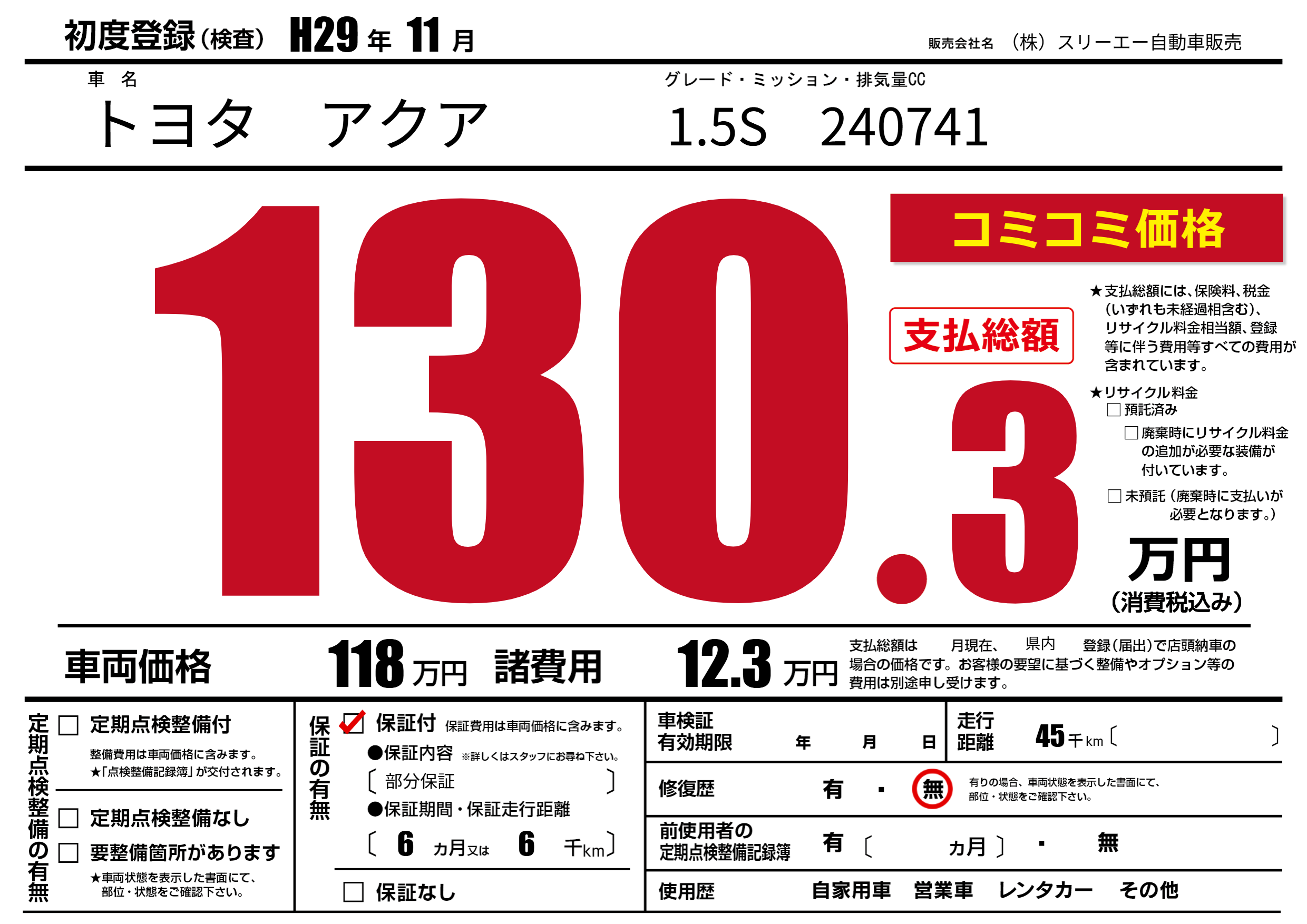 | 車名 | トヨタ アクア | グレード ミッション 排気量 |