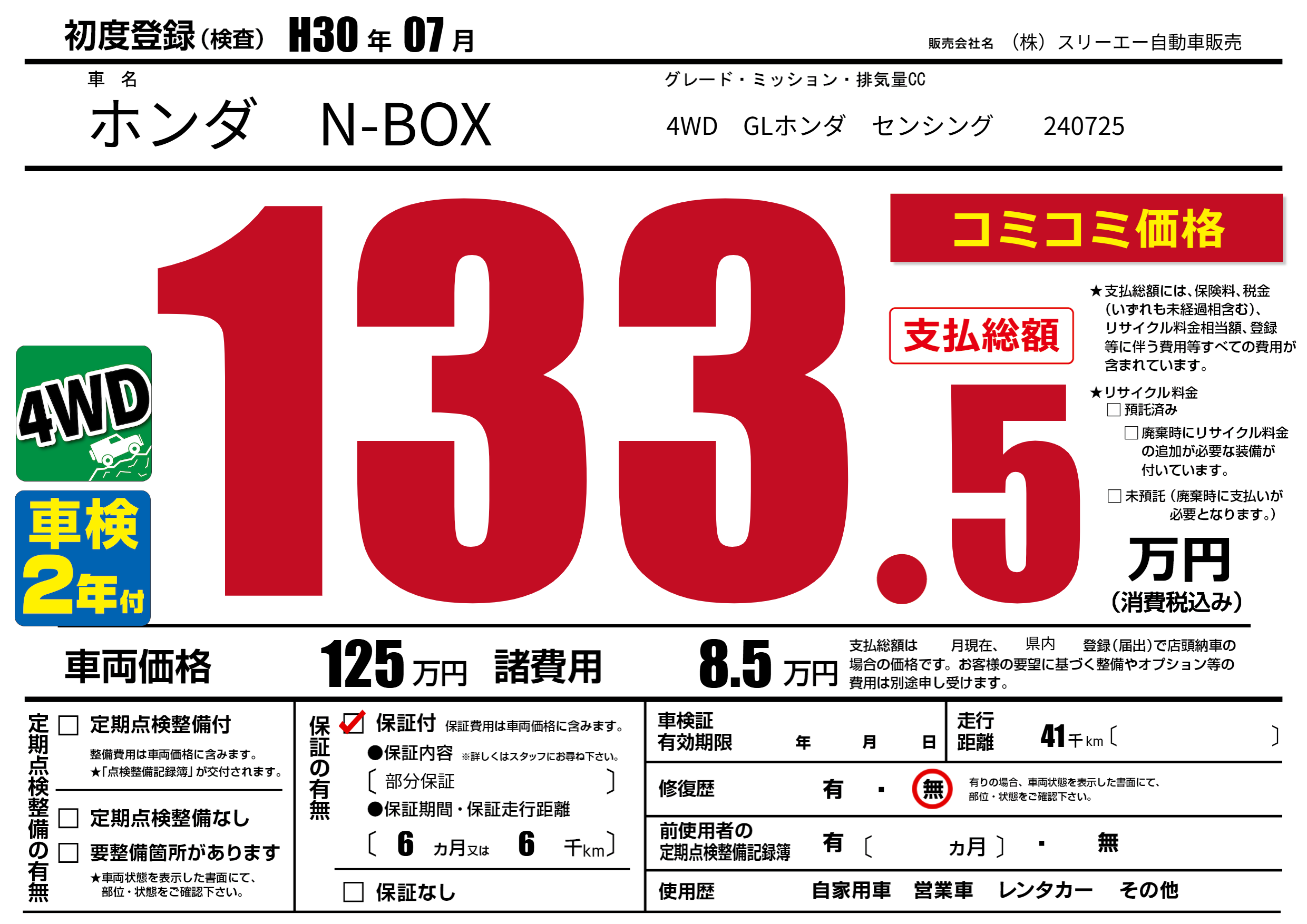 | 車名 | ホンダ N-BOX | グレード ミッション 排気量 |