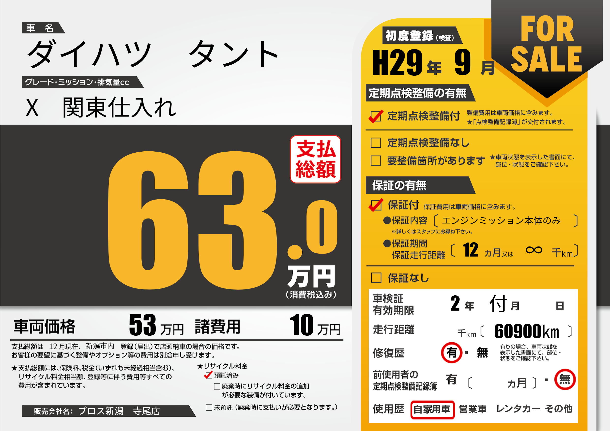 | 車名 | ダイハツ タント | グレード ミッション 排気量 |