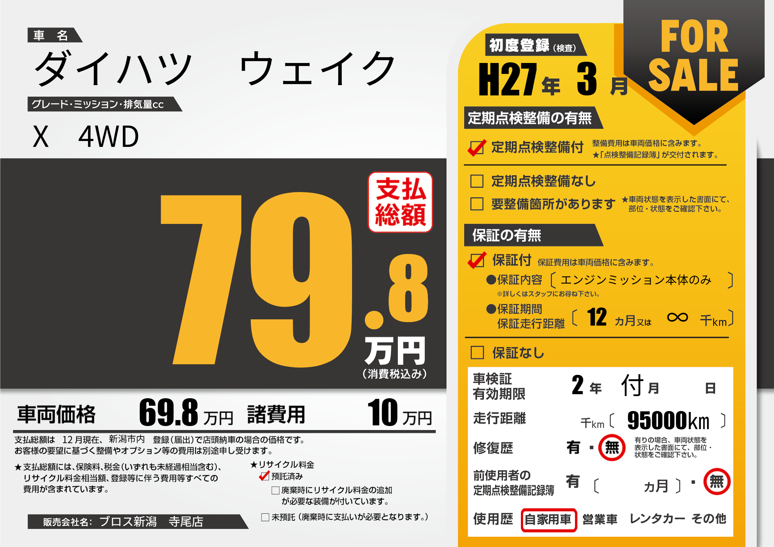 | 車名 | ダイハツ ウェイク | グレード ミッション 排気量 |