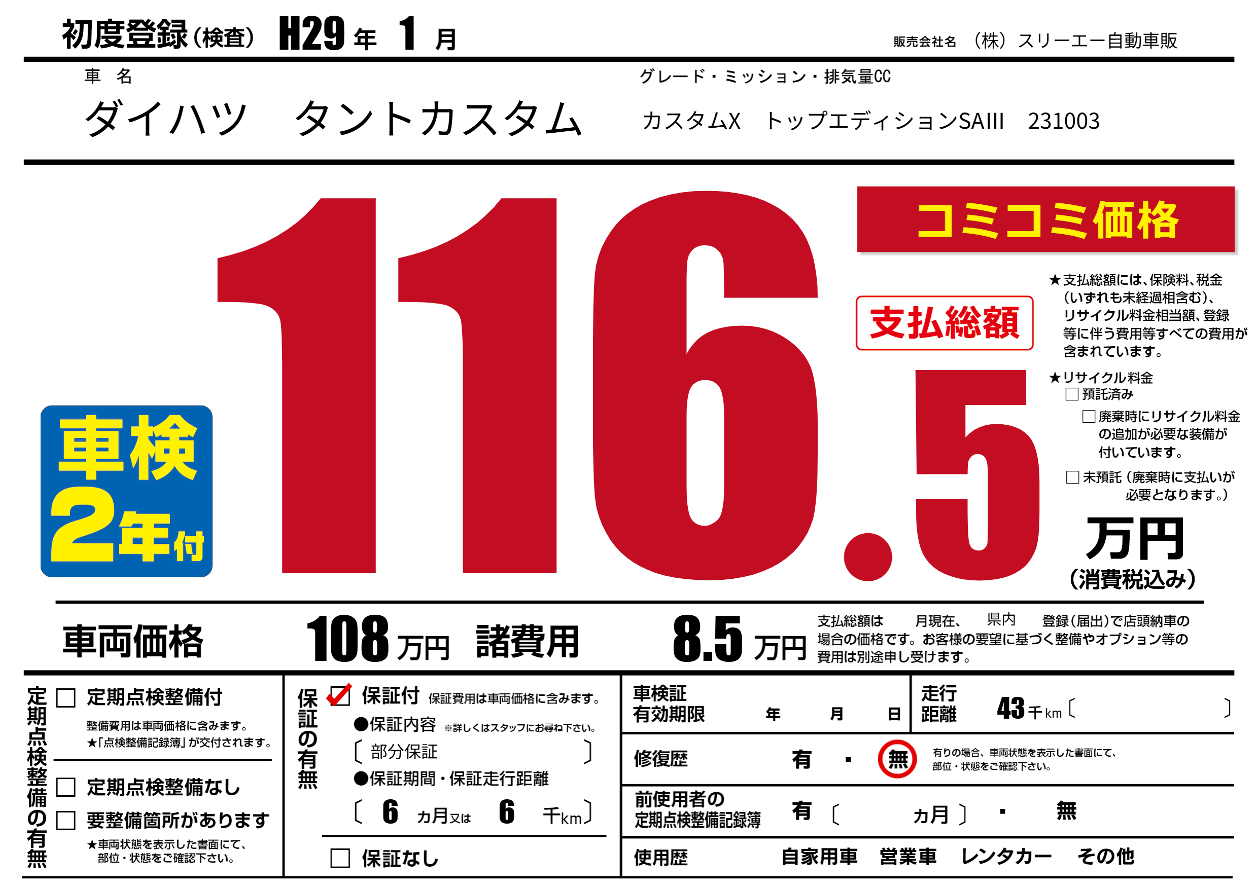 | 走行キロ | 4.3万km | 初年度登録 | H29年1月 |