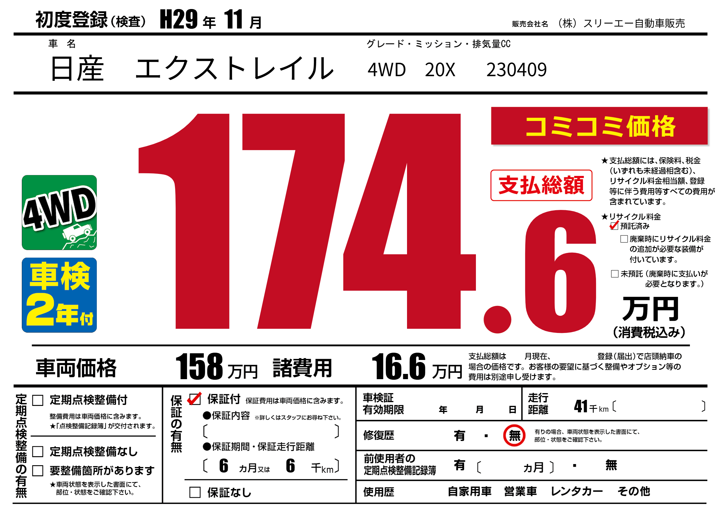 | 走行キロ | 4.1万km | 初年度登録 | H29年11月 |