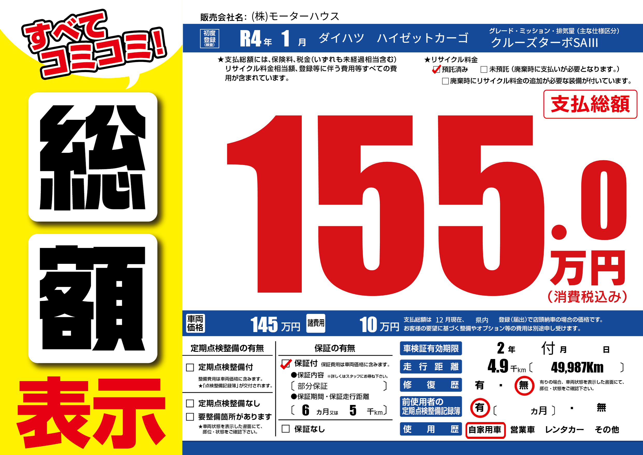| 車名 | ダイハツ ハイゼットカーゴ | グレード ミッション 排気量 |