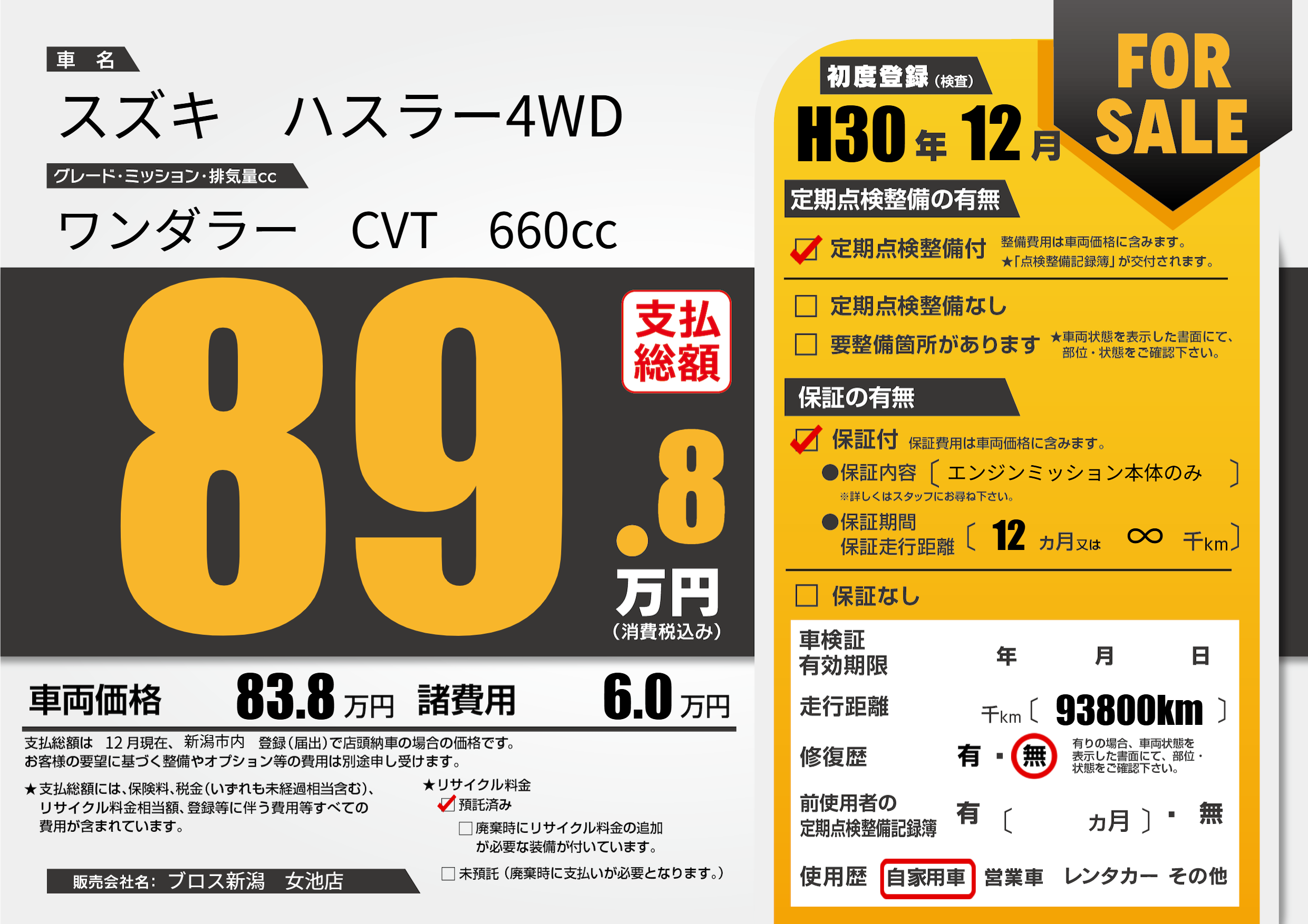 | 車名 | スズキ ハスラー4WD | グレード ミッション 排気量 |