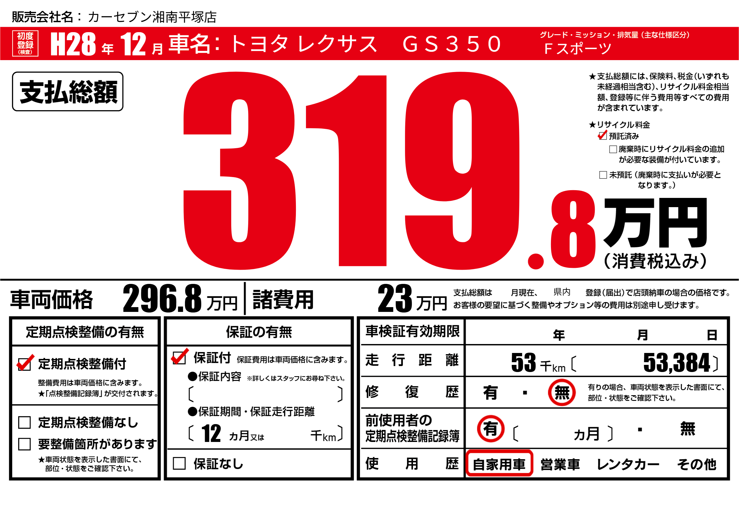 | 車名 | トヨタ レクサス GS350 | グレード ミッション 排気量 |