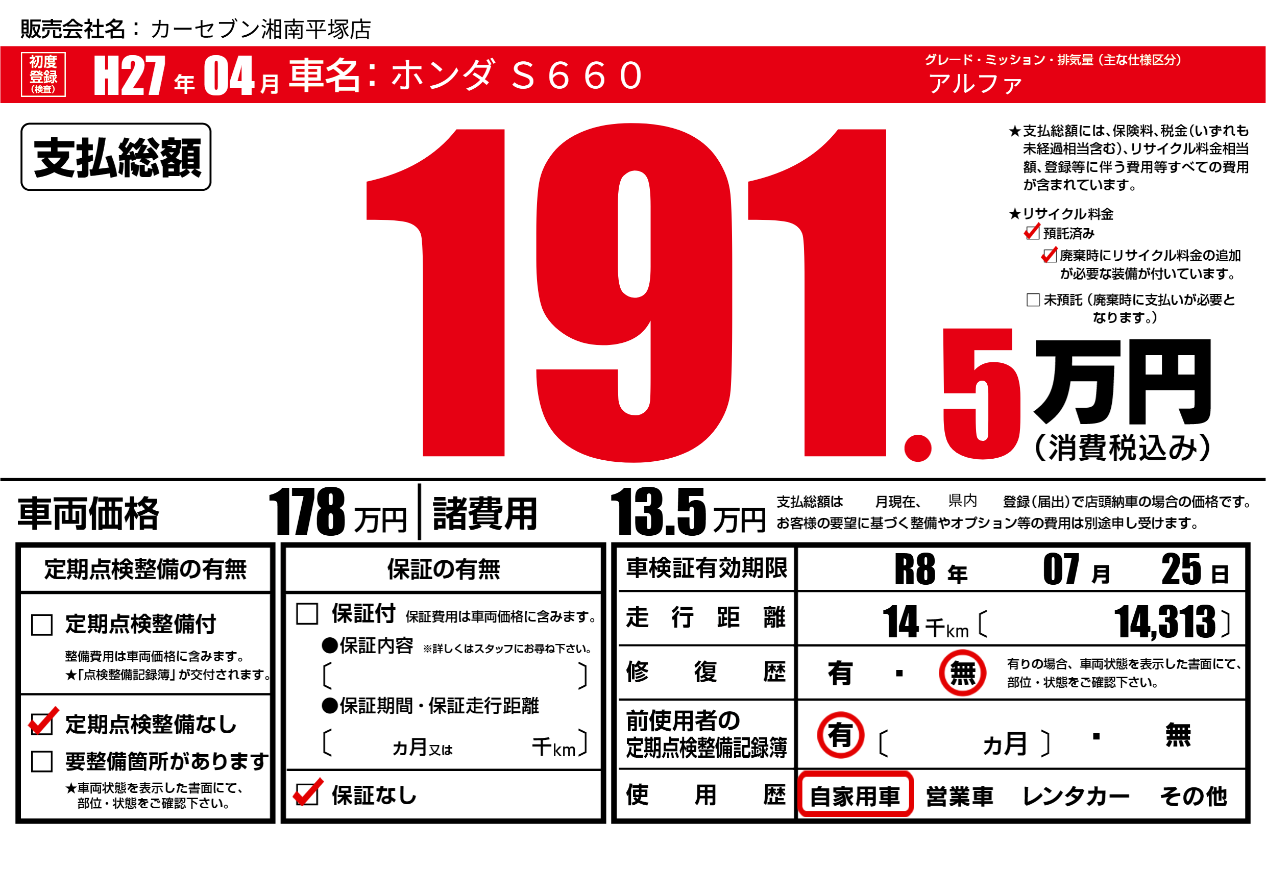 | 走行キロ | 1.4万km | 初年度登録 | H27年04月 |