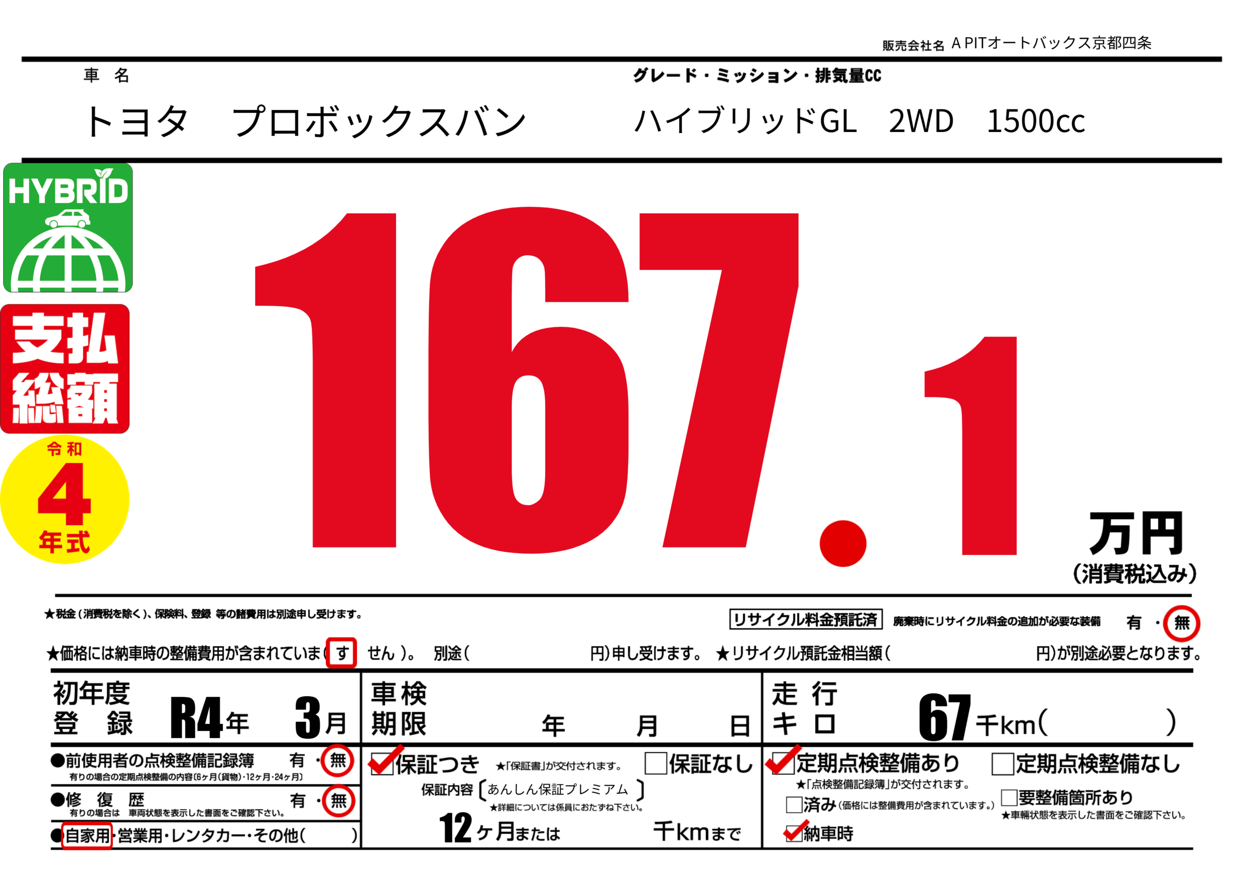 | 車名 | トヨタ プロボックスバン | グレード ミッション 排気量 |