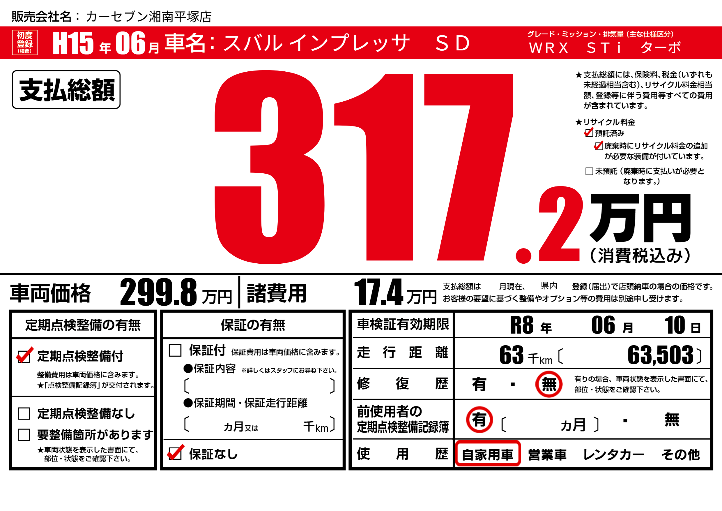 | 走行キロ | 6.3万km | 初年度登録 | H15年06月 |