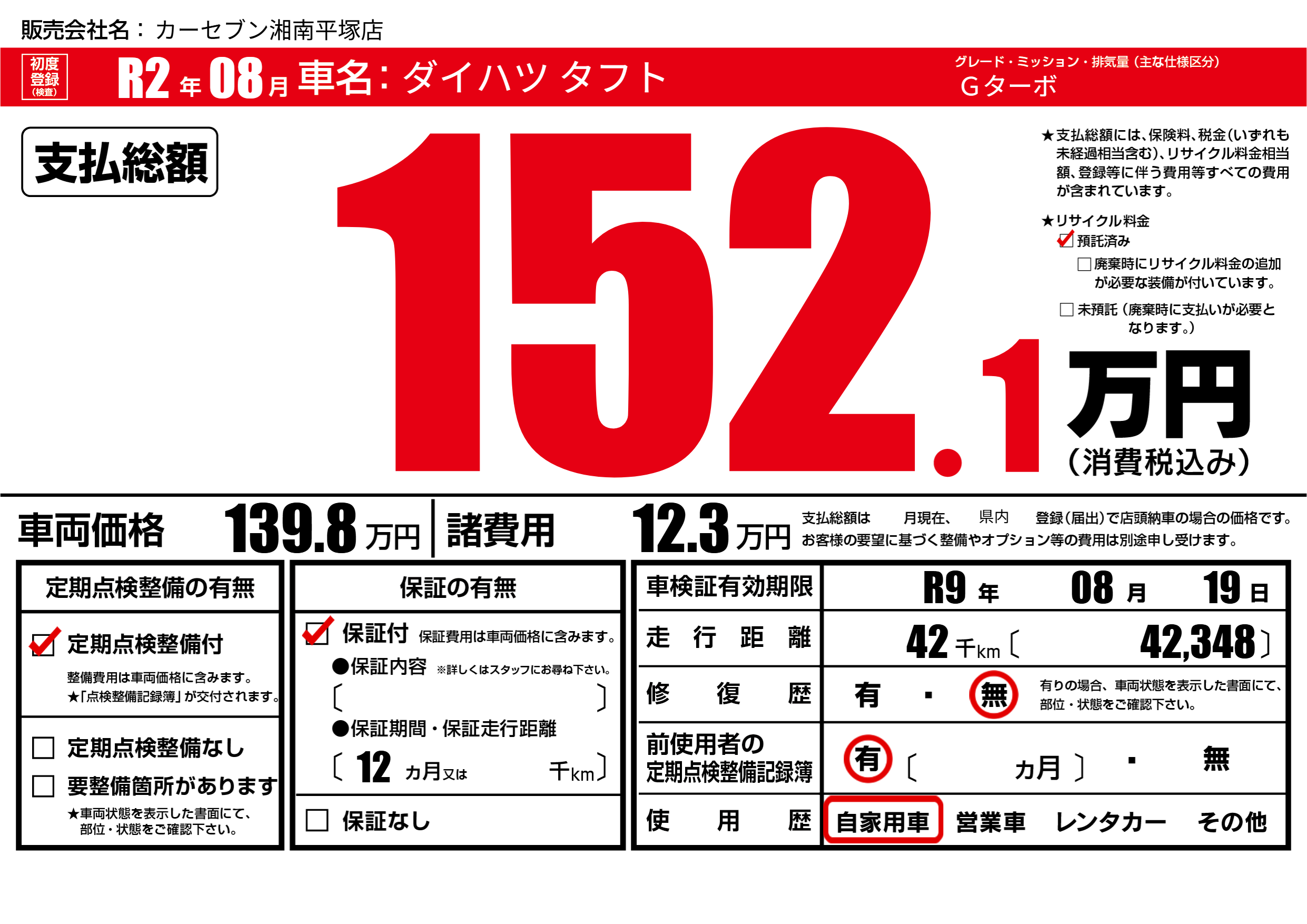 | 走行キロ | 4.2万km | 初年度登録 | R2年08月 |