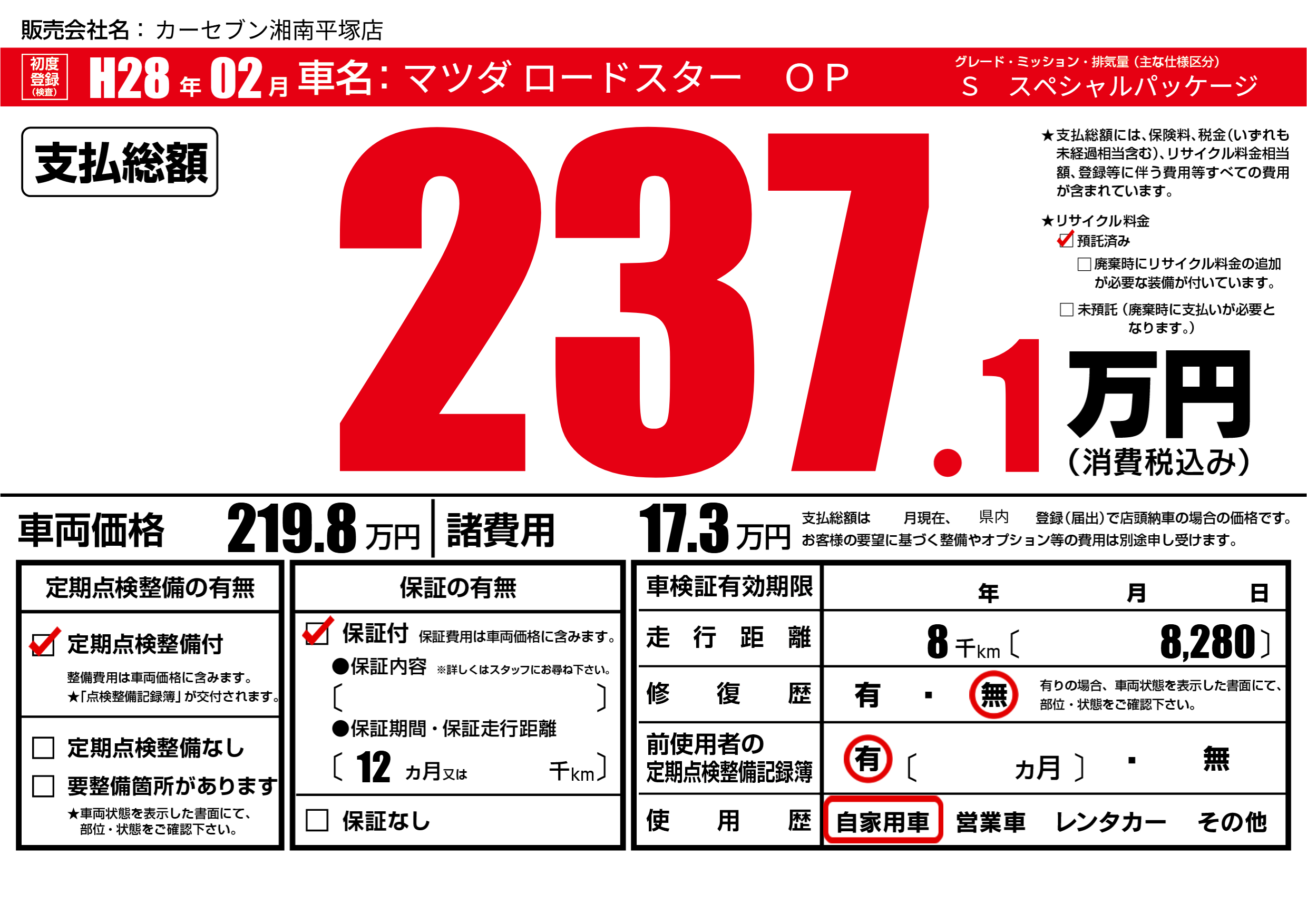 | 走行キロ | 0.8万km | ||