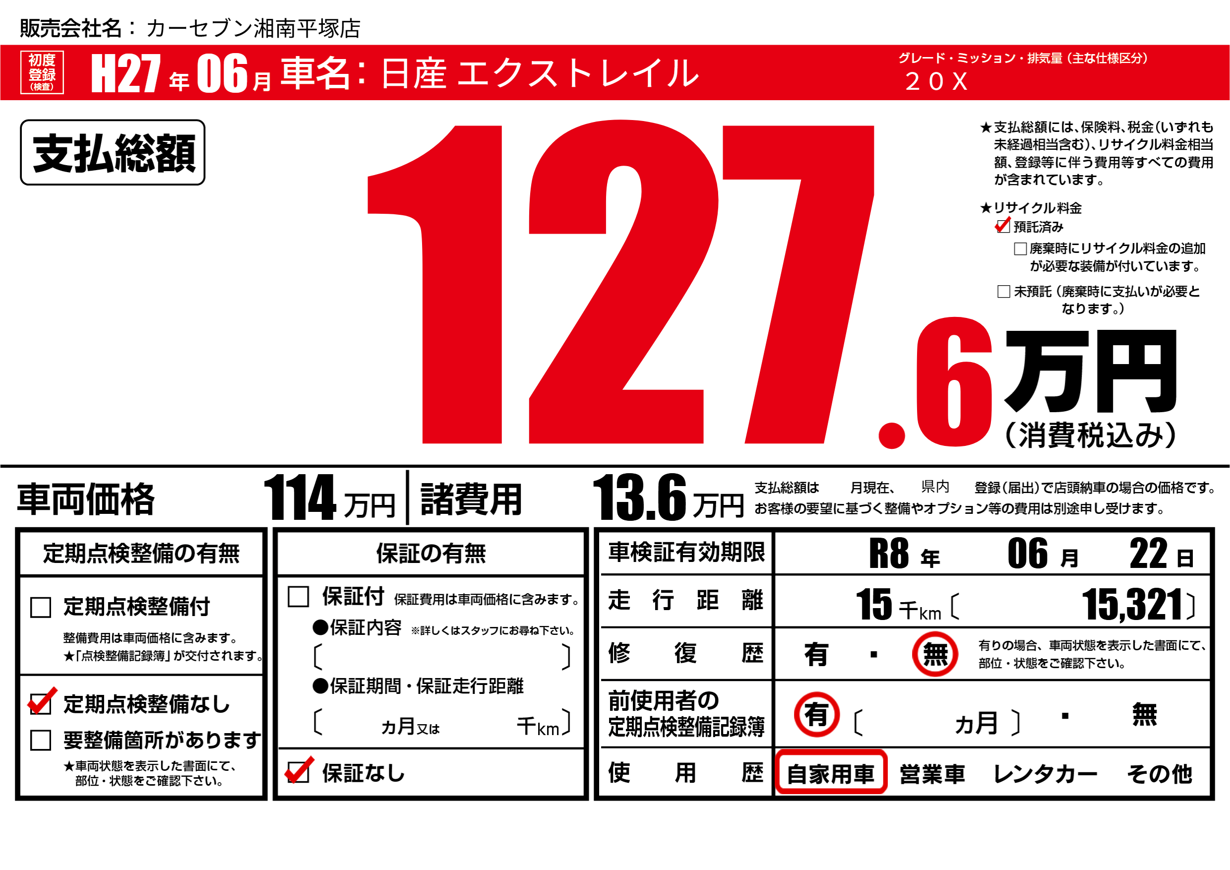 | 走行キロ | 1.5万km | 初年度登録 | H27年06月 |
