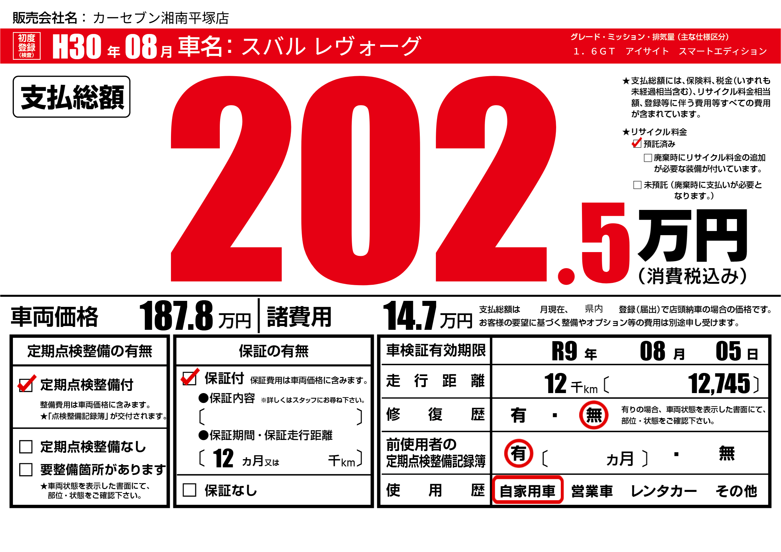 | 車名 | スバル レヴォーグ | グレード ミッション 排気量 |