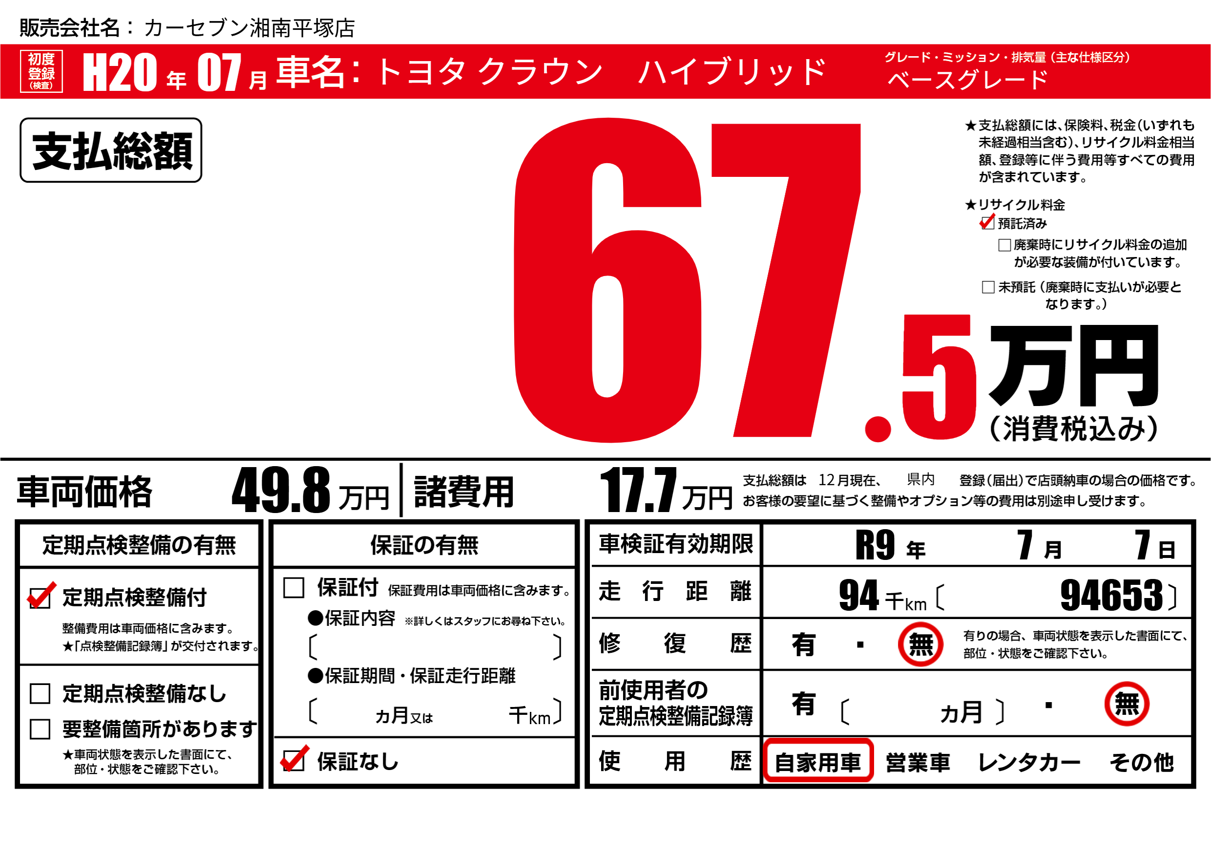| 車名 | トヨタ クラウン ハイブリッド | グレード ミッション 排気量 |