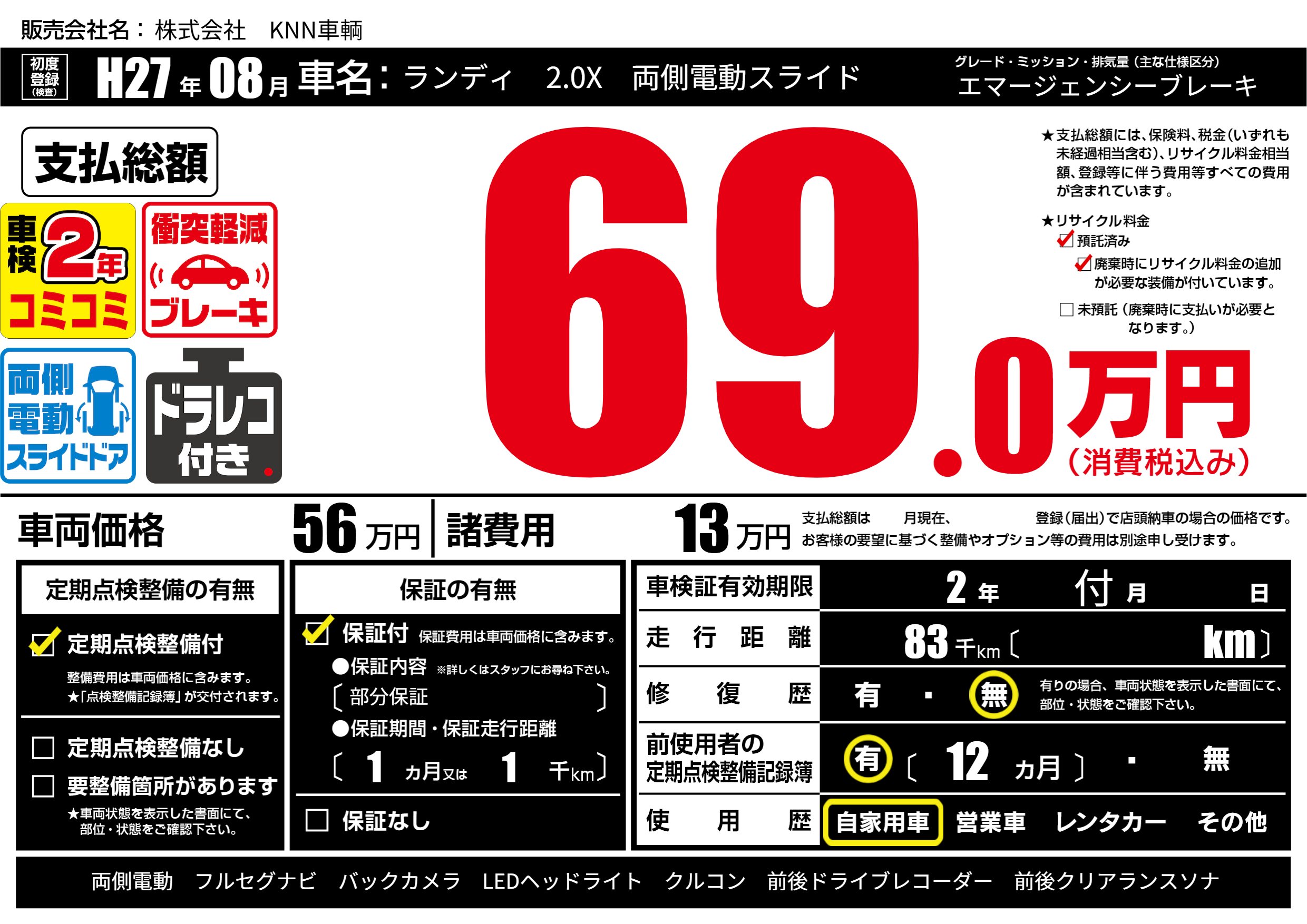 | 車名 | ランディ 2.0X 両側電動スライド | グレード ミッション 排気量 |