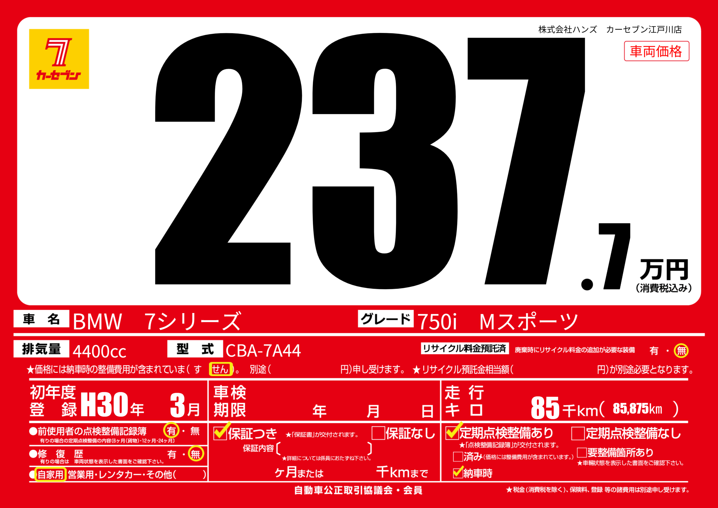 | 車名 | BMW 7シリーズ | グレード ミッション 排気量 |