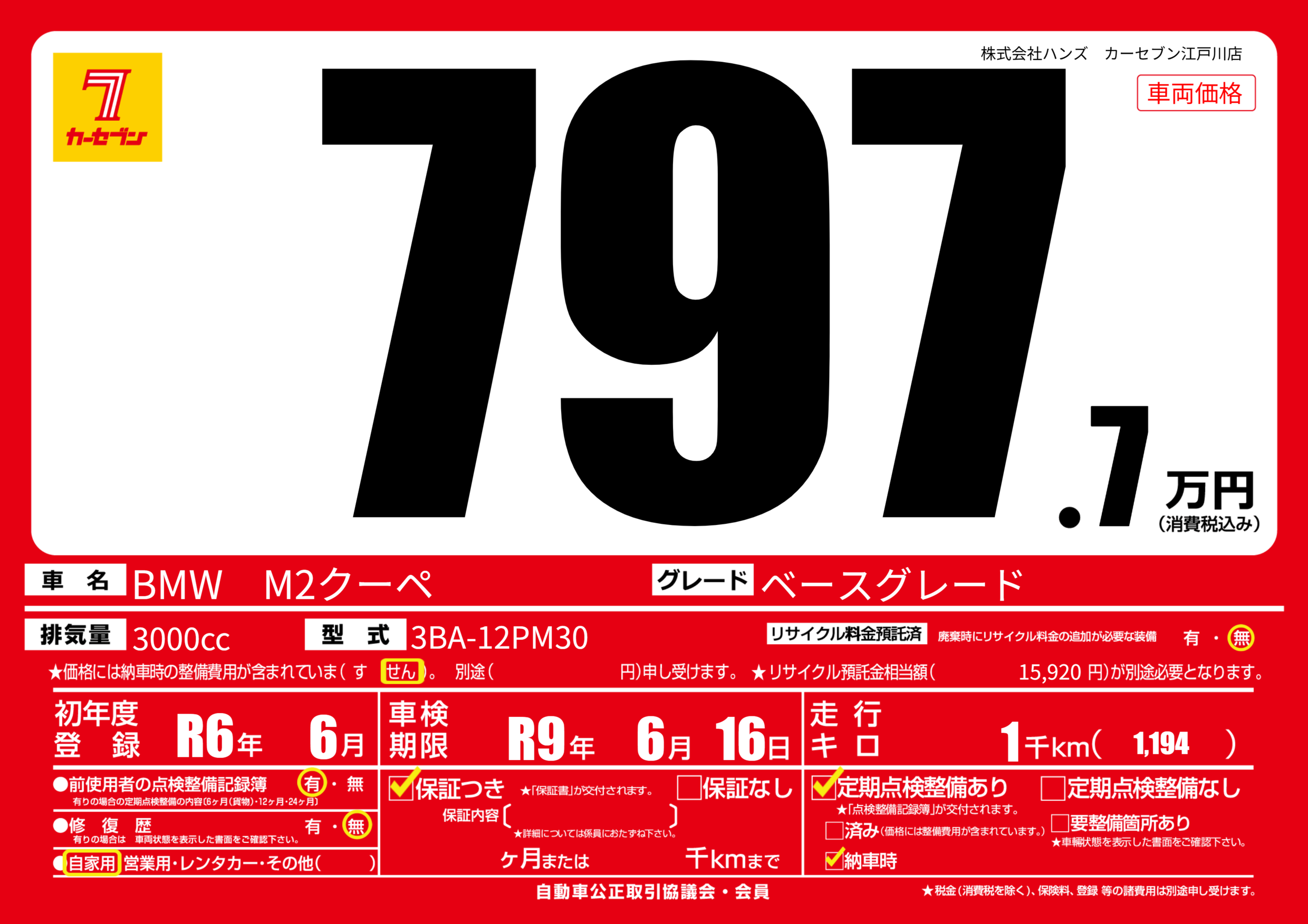 | 車名 | BMW M2クーペ | グレード ミッション 排気量 |