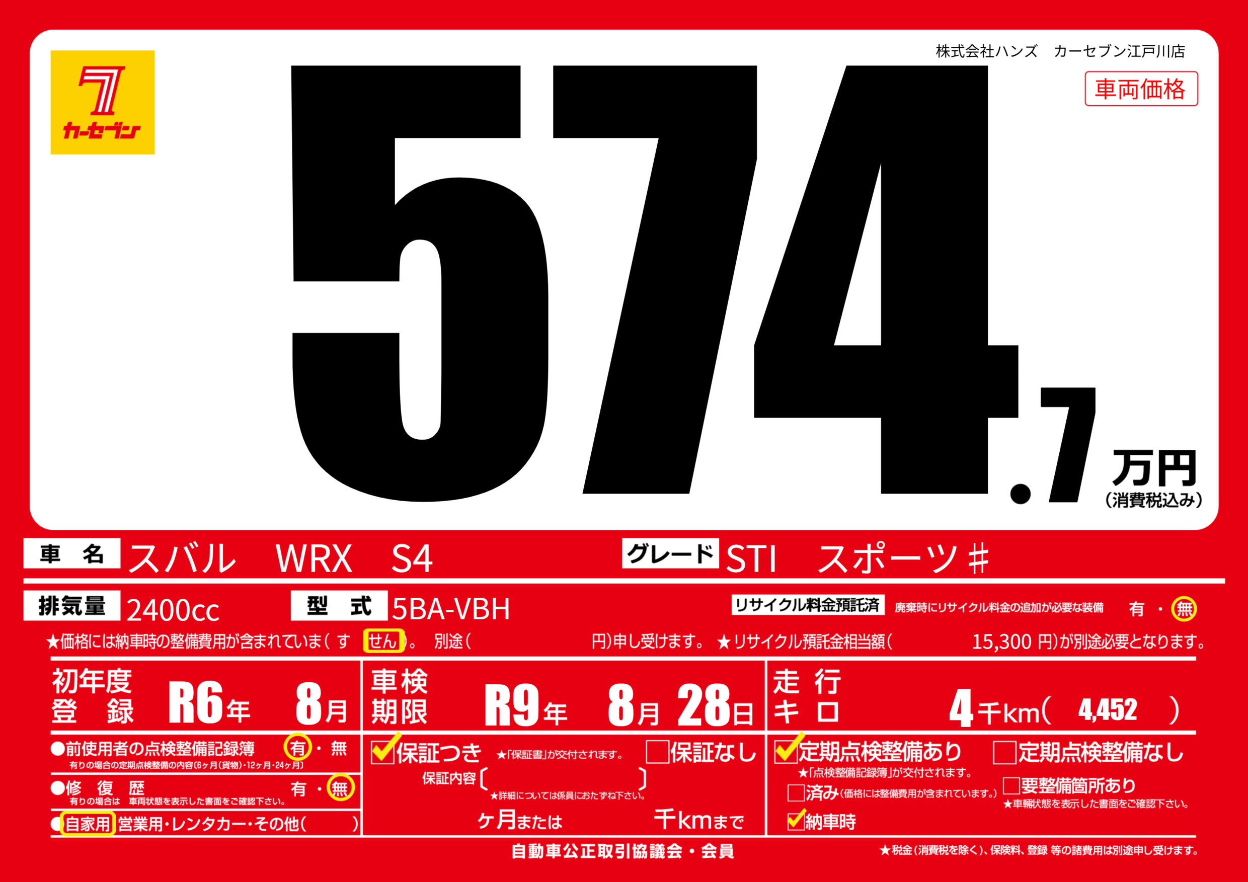 | 車名 | スバル WRX S4 | グレード ミッション 排気量 |