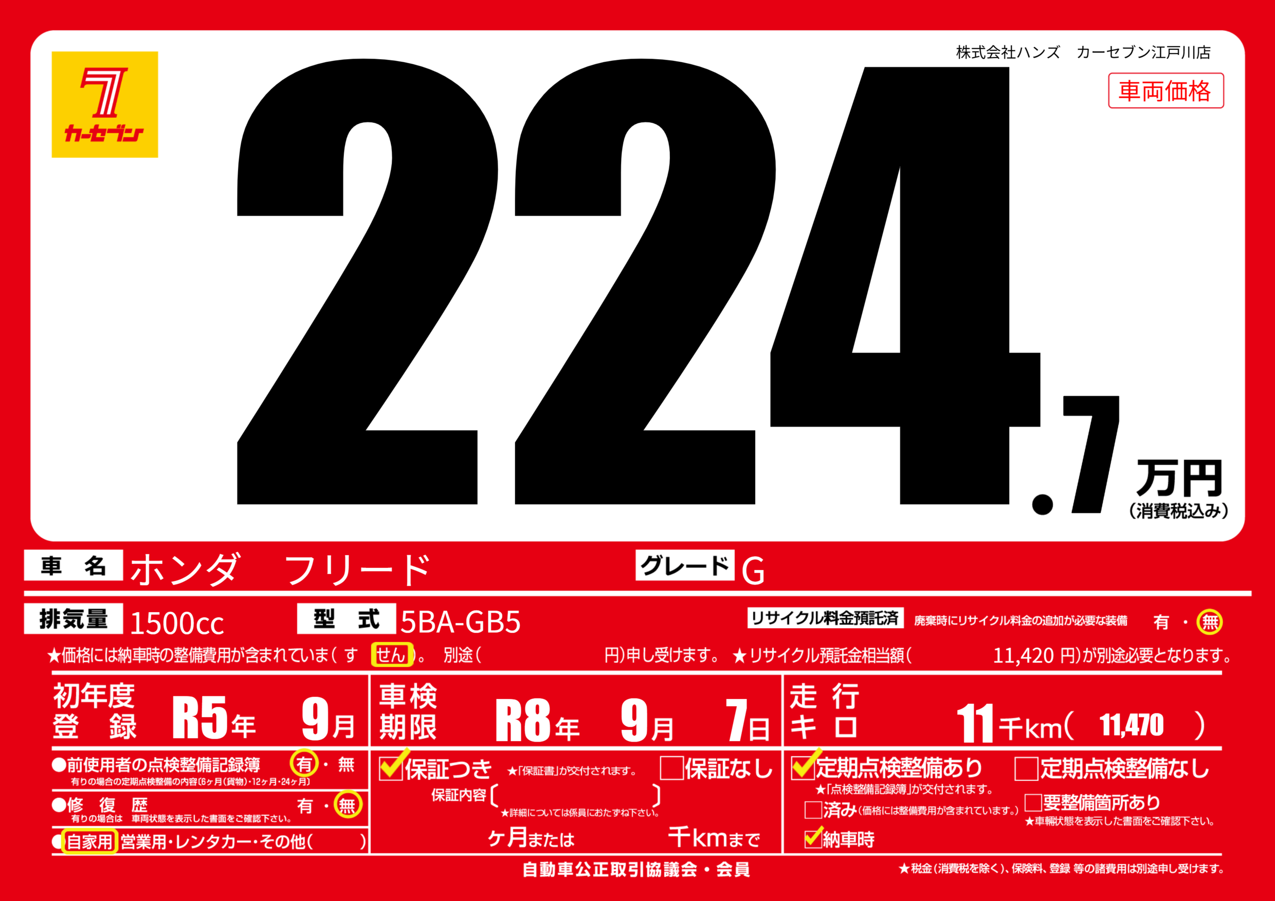 | 走行キロ | 1.1万km | 初年度登録 | R5年9月 |