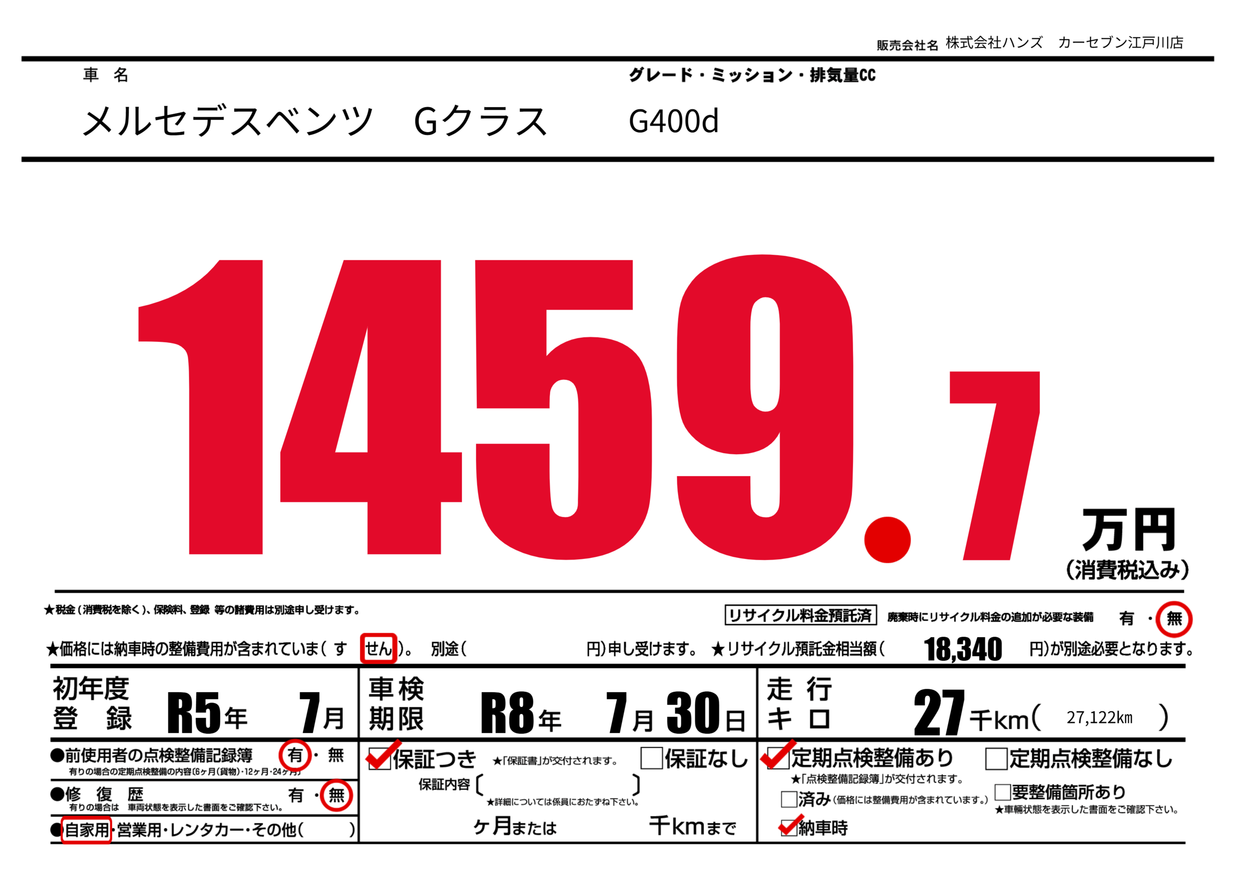 | 車名 | メルセデスベンツ Gクラス | グレード ミッション 排気量 |