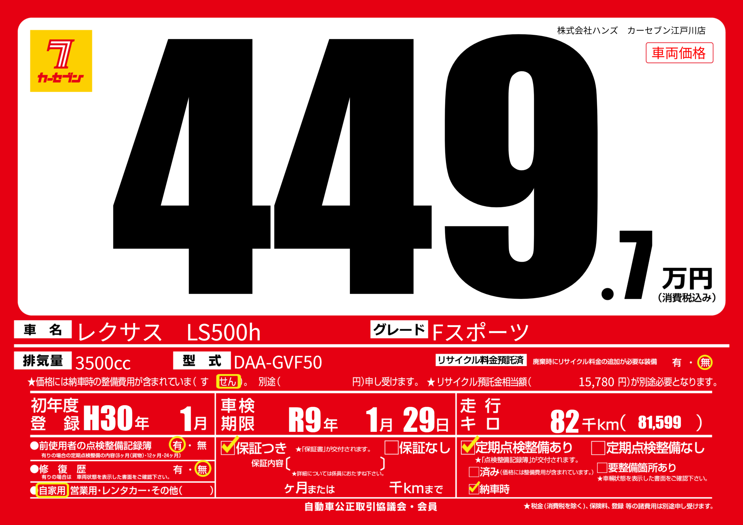 | 車名 | レクサス LS500h | グレード ミッション 排気量 |