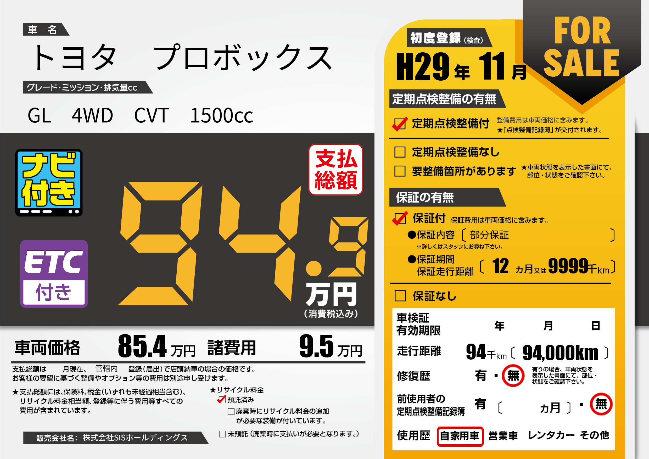 | 車名 | トヨタ プロボックス | グレード ミッション 排気量 |