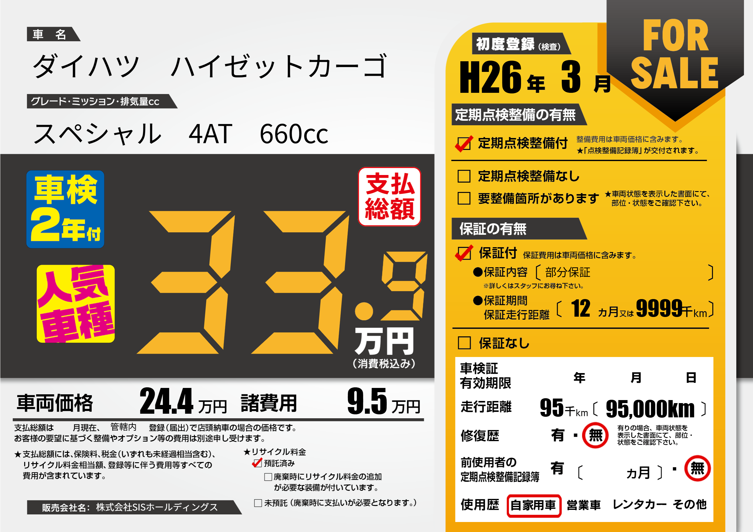 | 走行キロ | 9.5万km | 初年度登録 | H26年3月 |