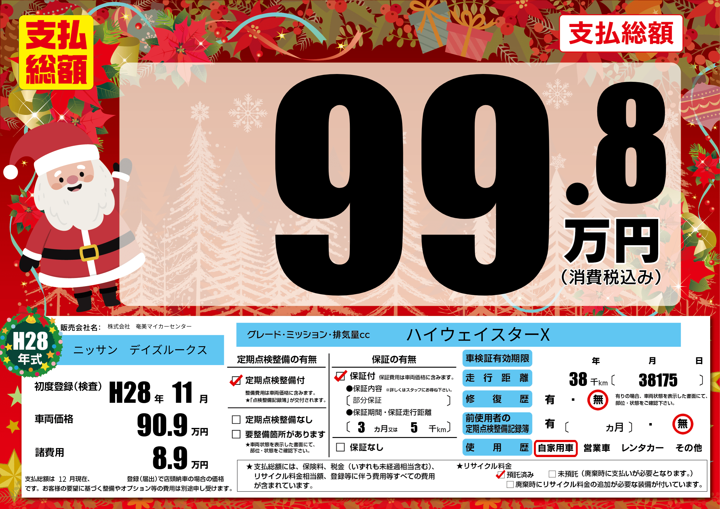 | 走行キロ | 3.8万km | 初年度登録 | H28年11月 |