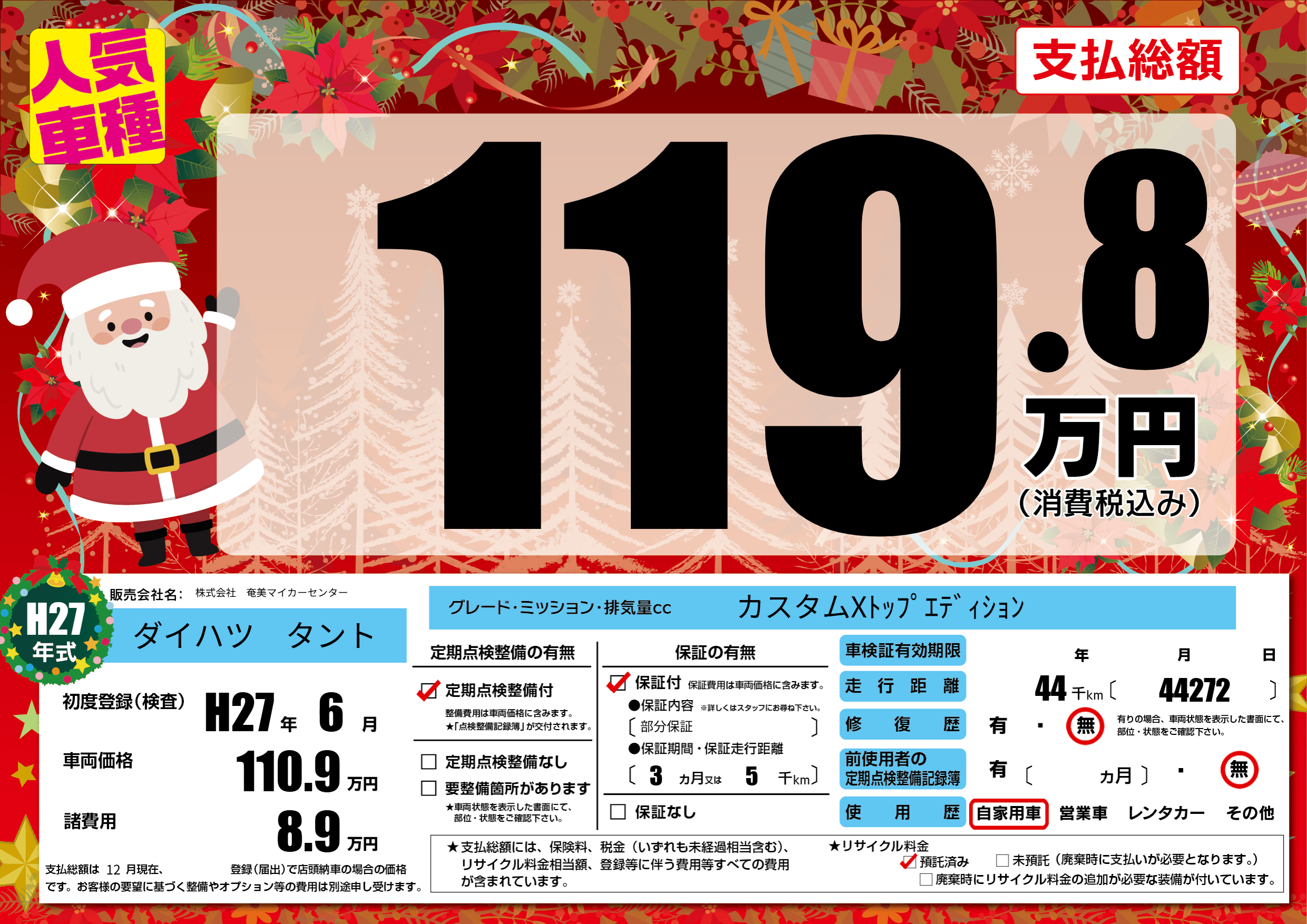 | 車名 | ダイハツ タント | グレード ミッション 排気量 |