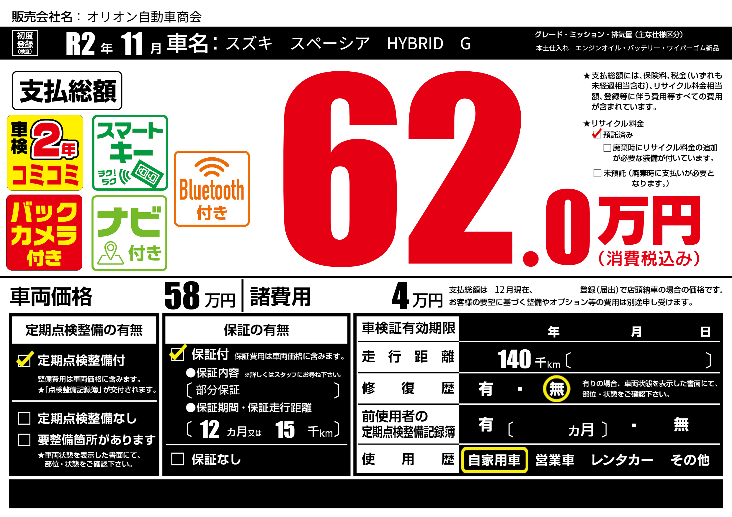 保証付き 保証内容(部分保証) 12ヶ月または(15)千kmまで |