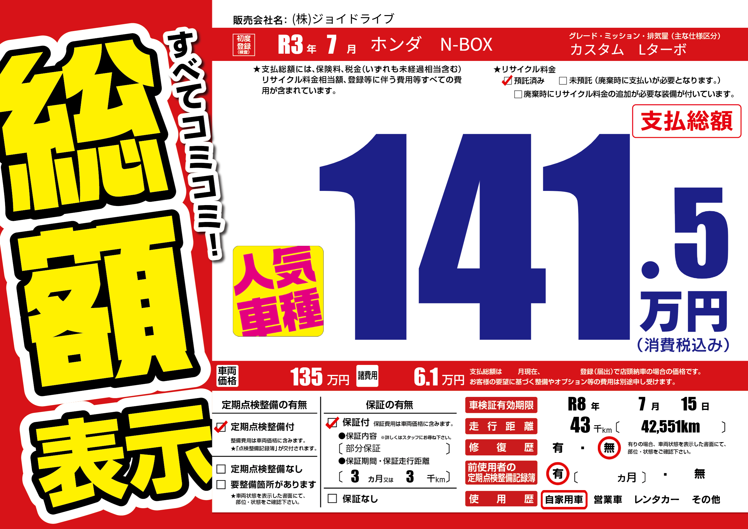 | 車名 | ホンダ N-BOX | グレード ミッション 排気量 |