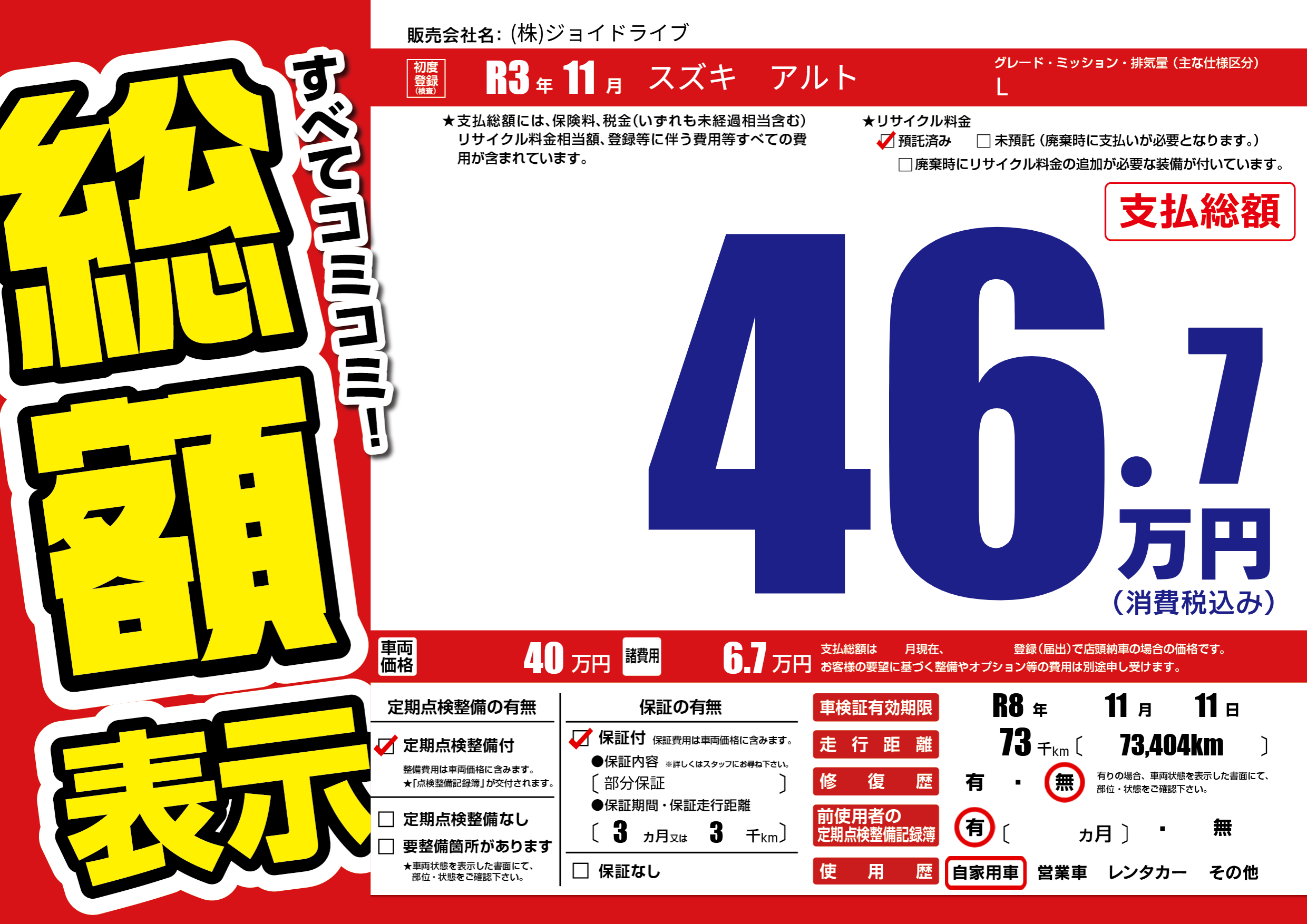 | 車名 | スズキ アルト | グレード ミッション 排気量 |