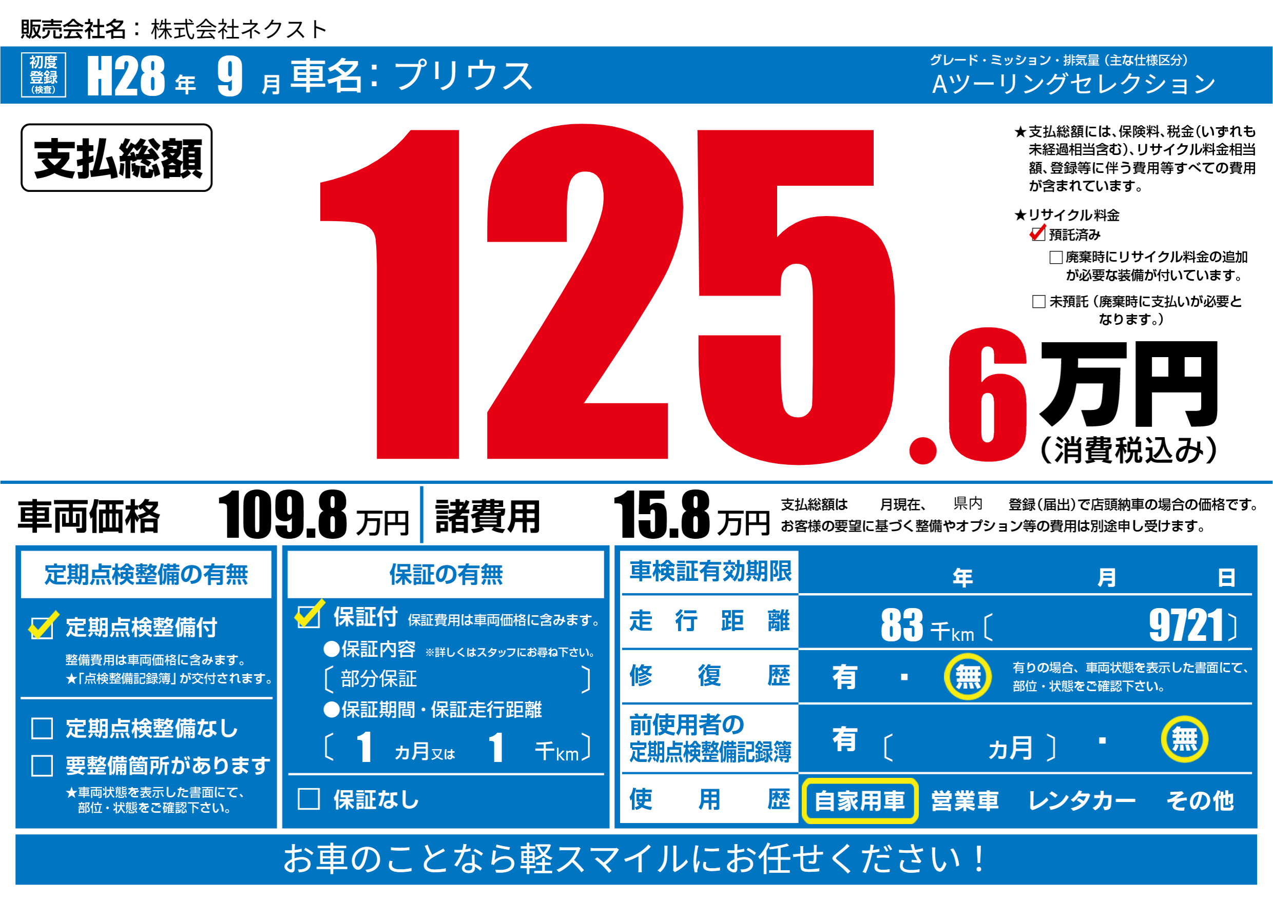 | 車名 | プリウス | グレード ミッション 排気量 |