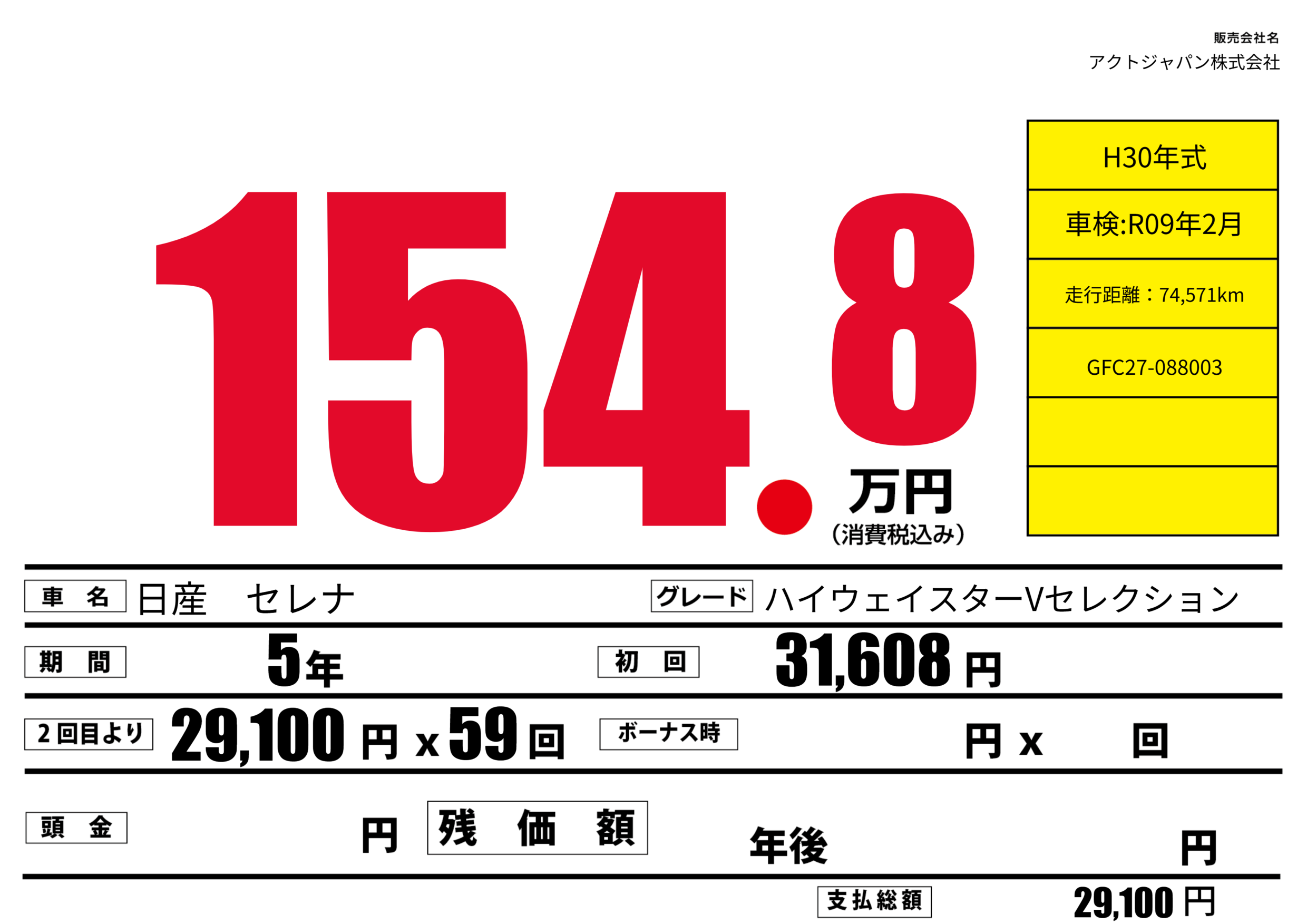 | 車名 | 日産 セレナ | グレード ミッション 排気量 |