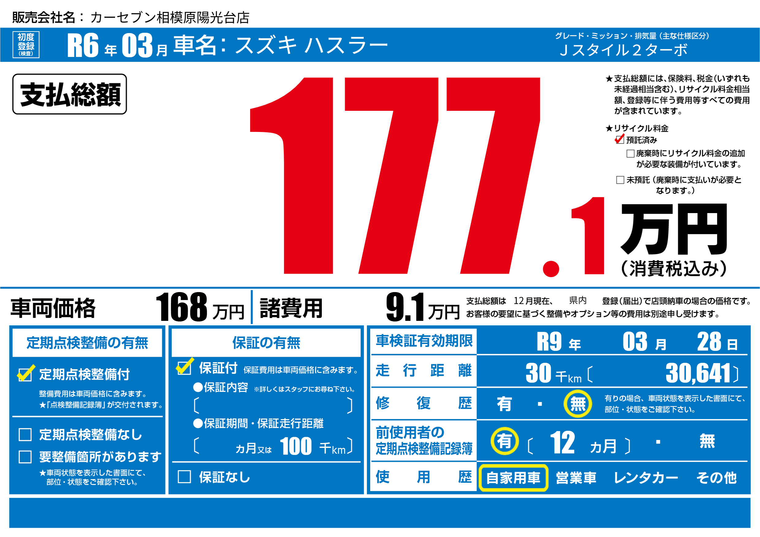 | 走行キロ | 3万km | 初年度登録 | R6年03月 |
