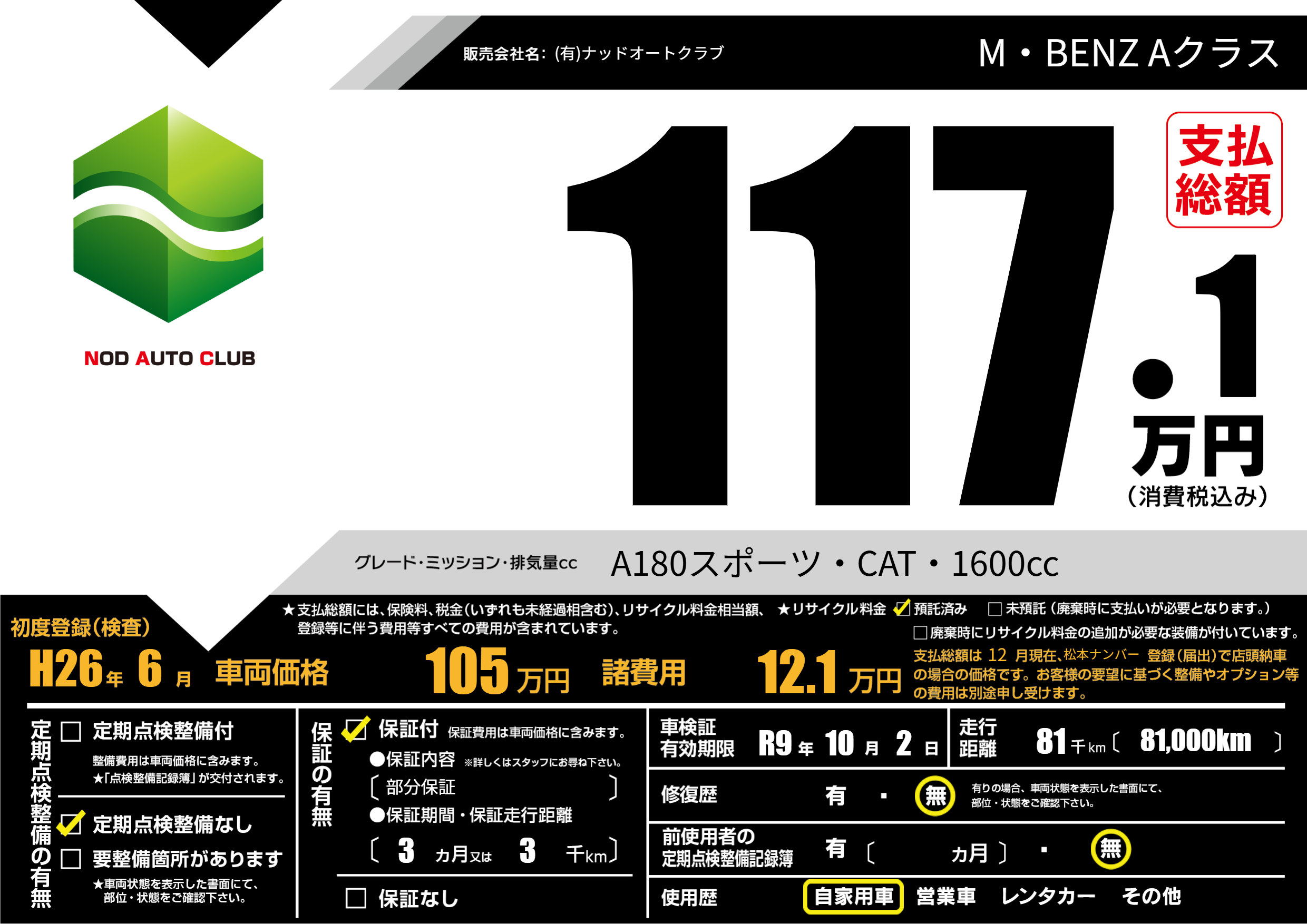 | 車名 | M・BENZ Aクラス | グレード ミッション 排気量 |