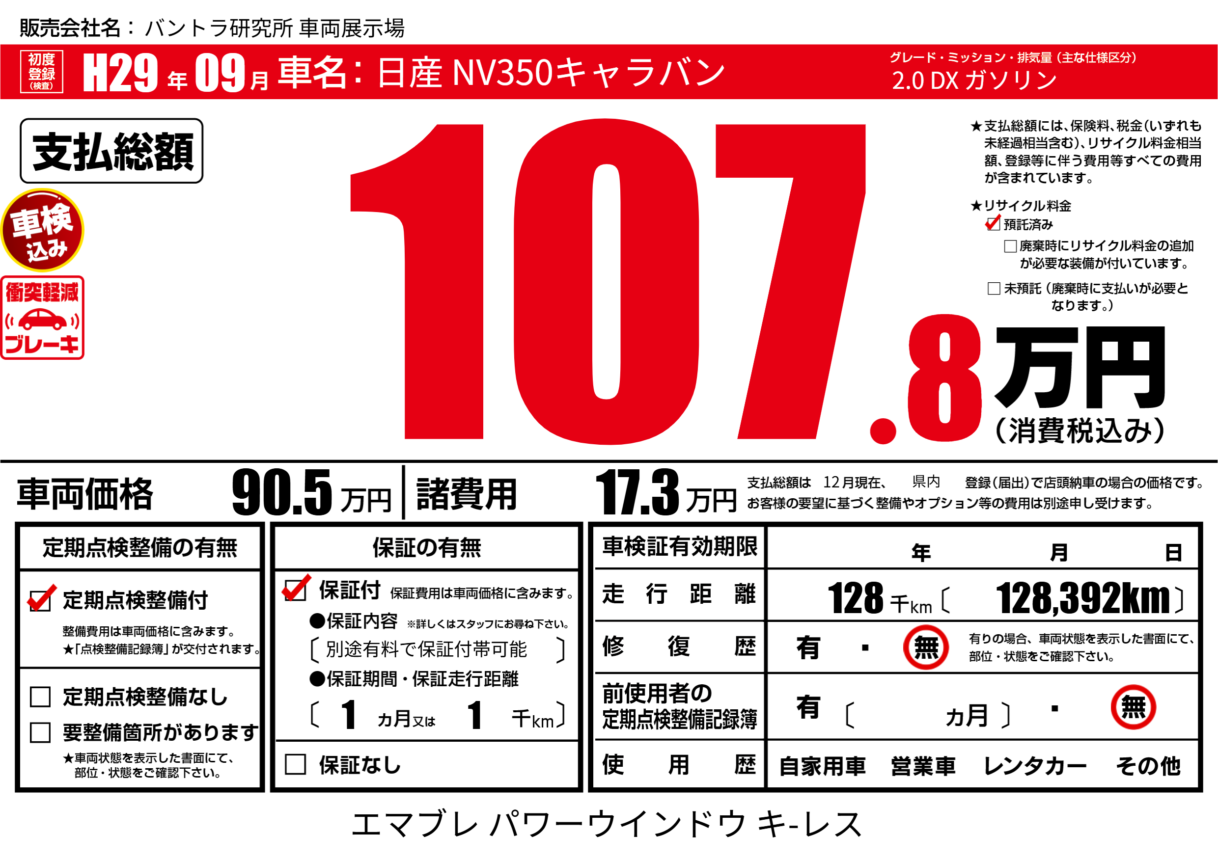 | 走行キロ | 12.8万km | 初年度登録 | H29年09月 |