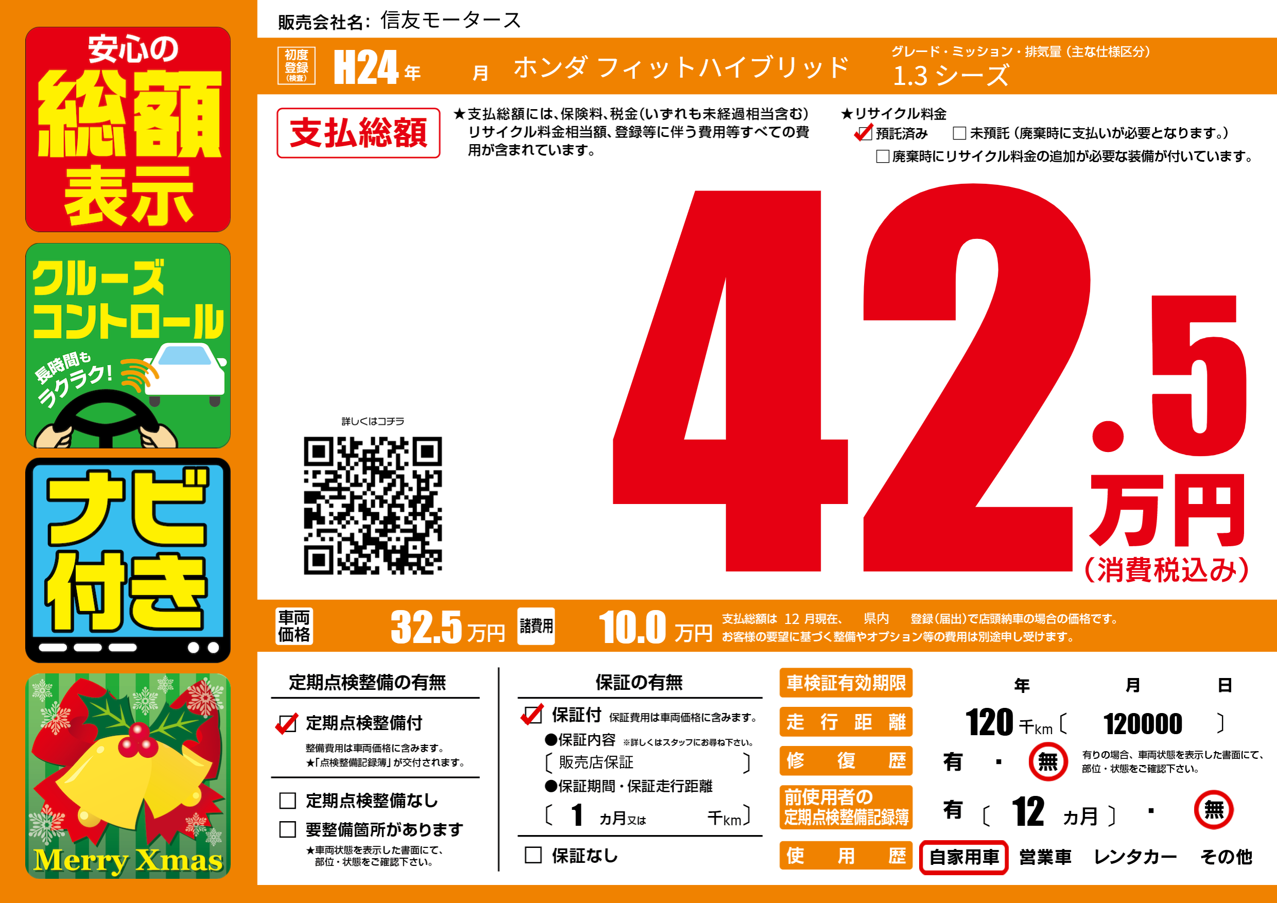 | 走行キロ | 12万km | 初年度登録 | H24年---月 |
