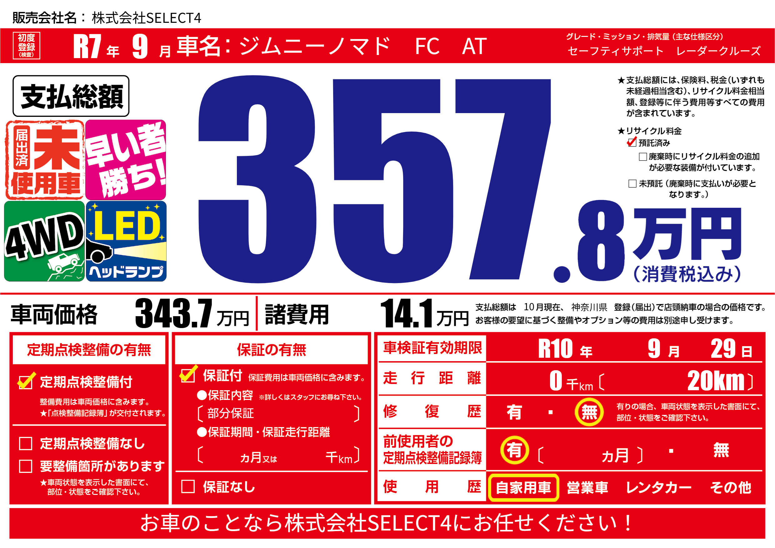 | 走行キロ | - | 初年度登録 | R7年9月 |
