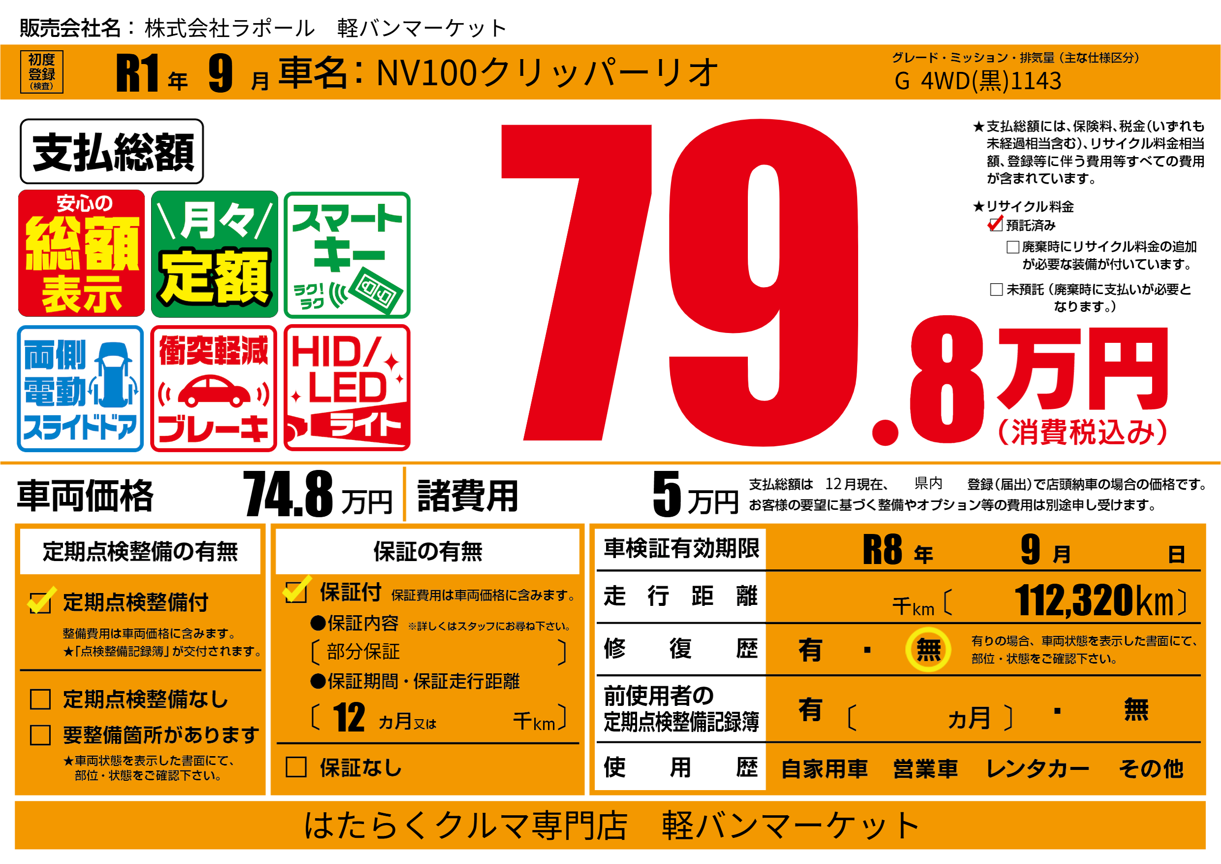 | 車名 | NV100クリッパーリオ | グレード ミッション 排気量 |