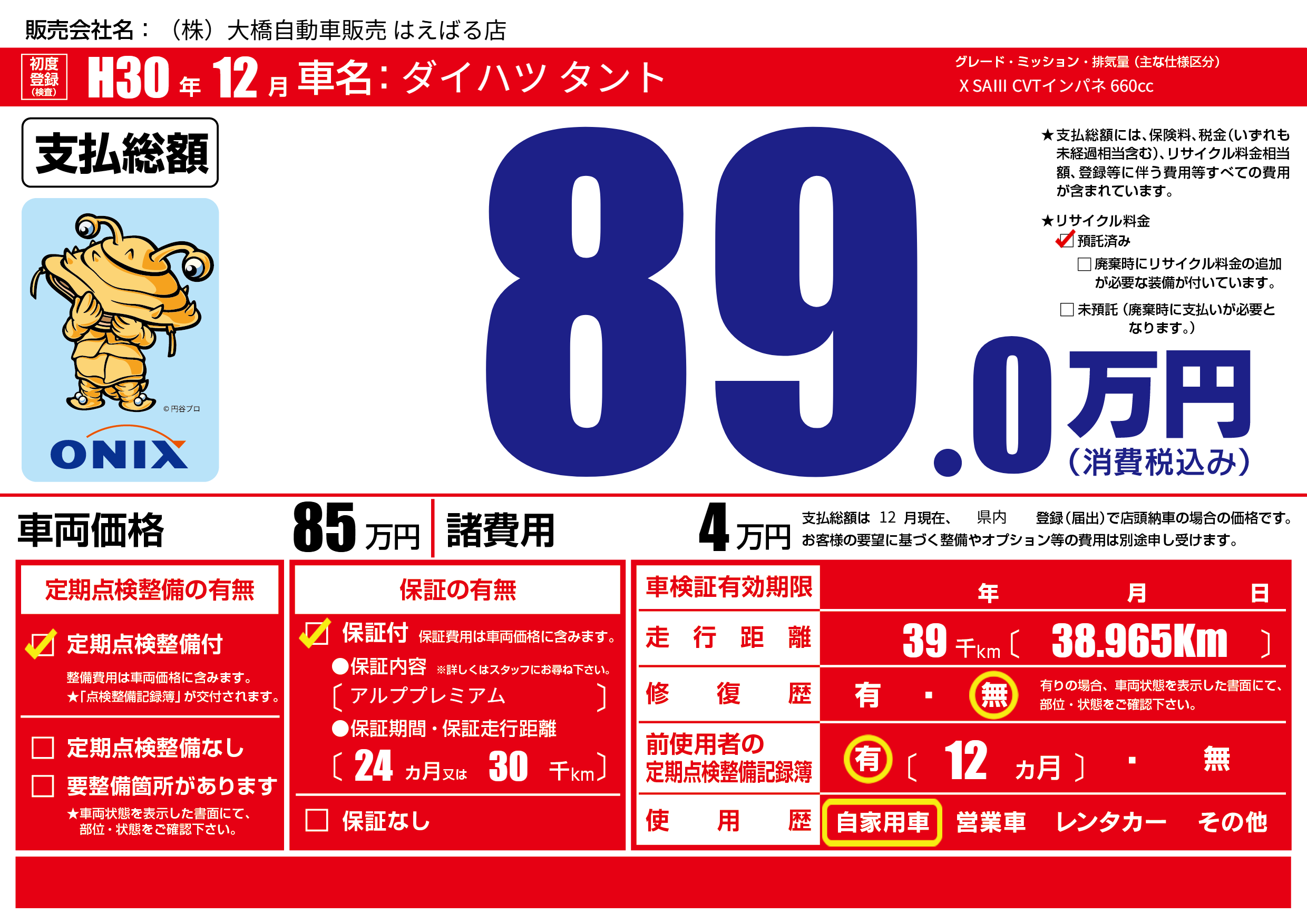 | 車名 | ダイハツ タント | グレード ミッション 排気量 |