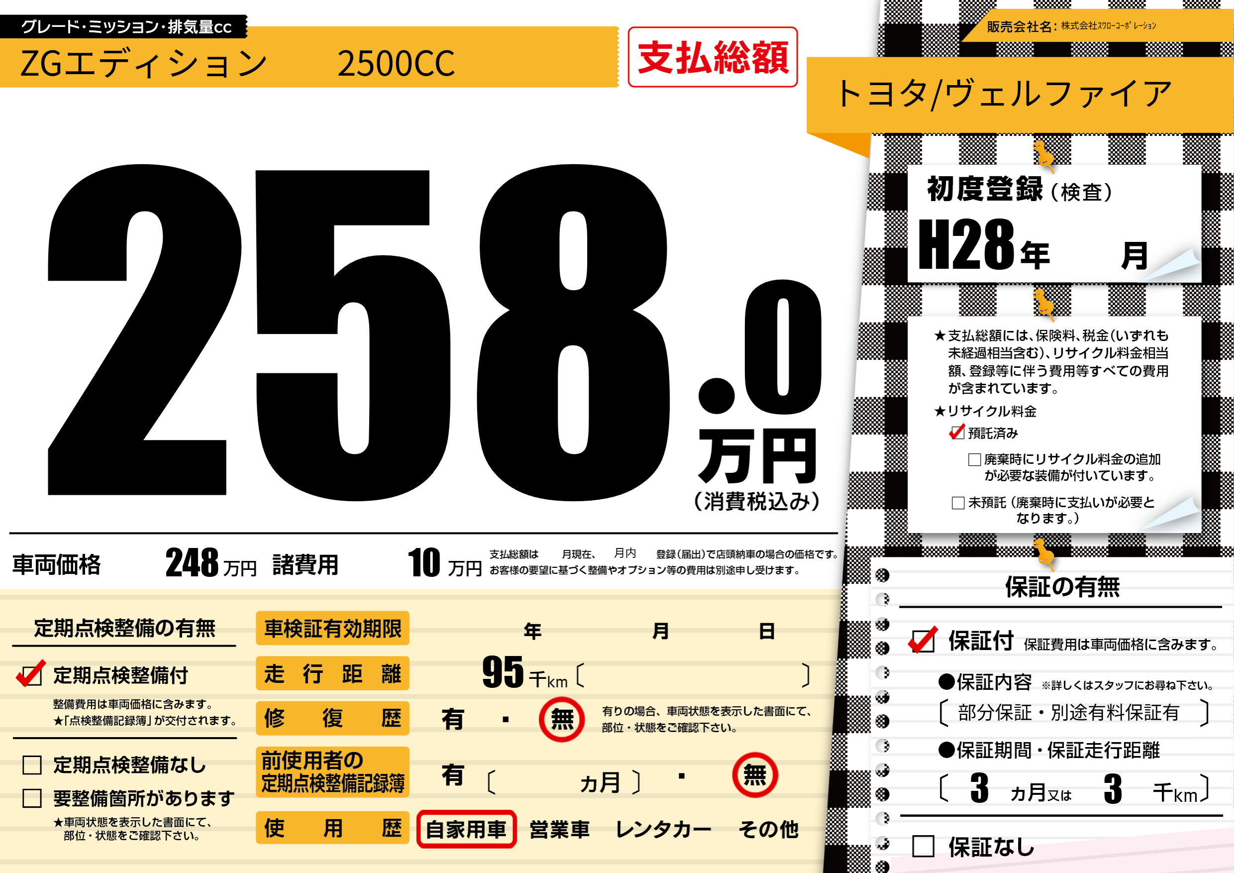 保証付き 保証内容(部分保証・別途有料保証有) 3ヶ月または(3)千kmまで |