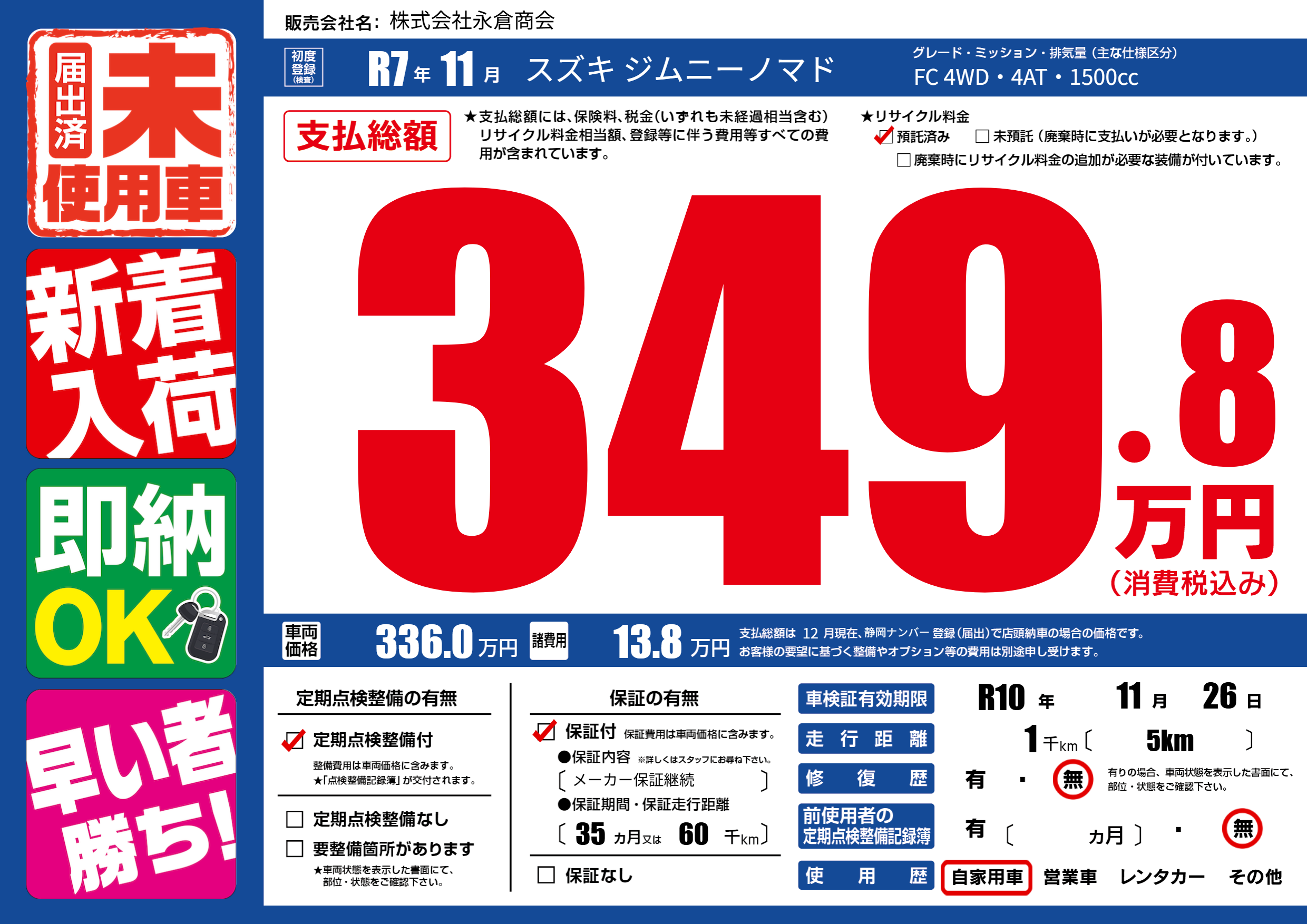 | 走行キロ | 0.1万km | 初年度登録 | R7年11月 |